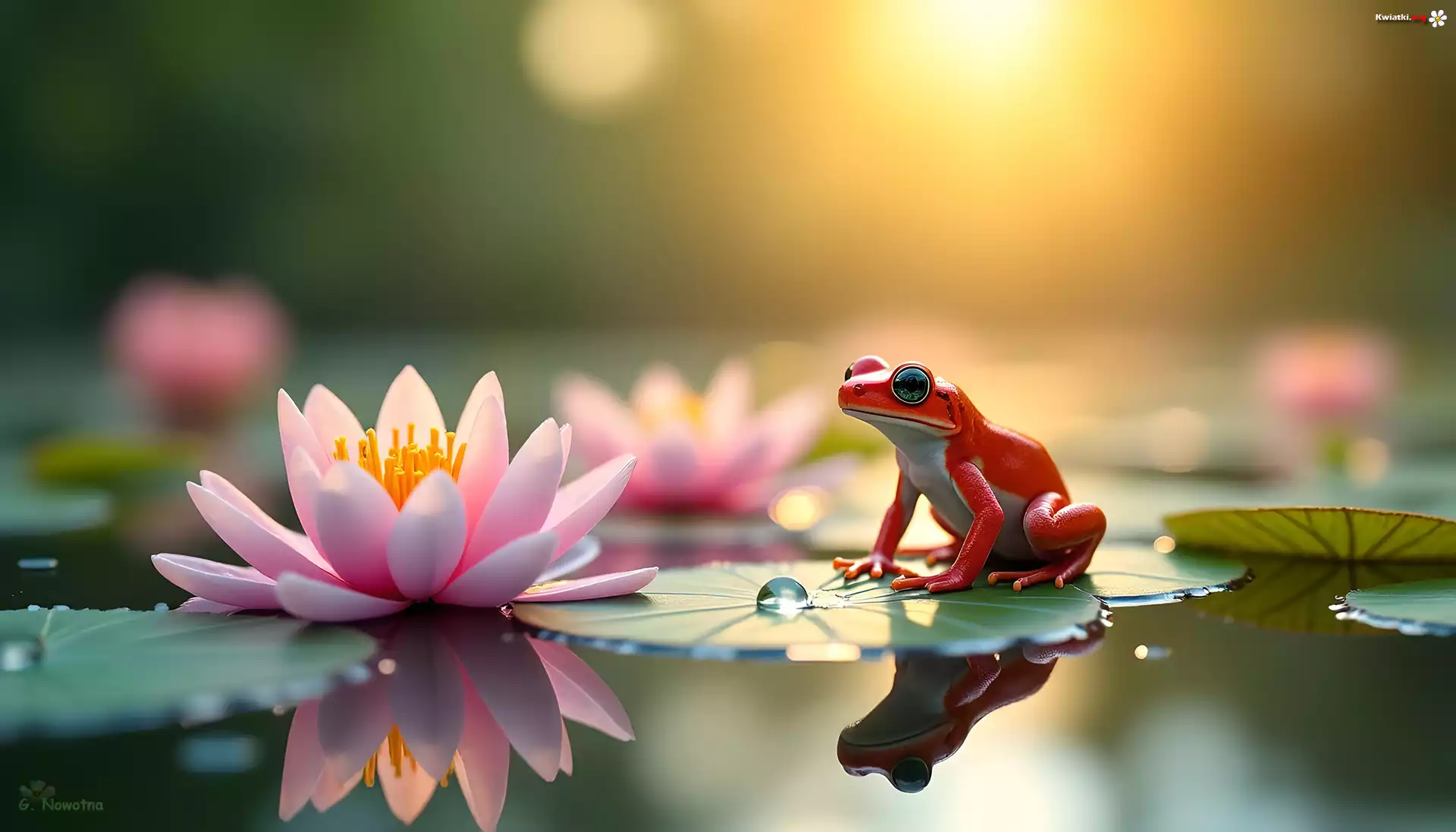 Pomarańczowa, Żaba, Lilia wodna, Liście, Krople, Grafika AI - Zdjęcia
