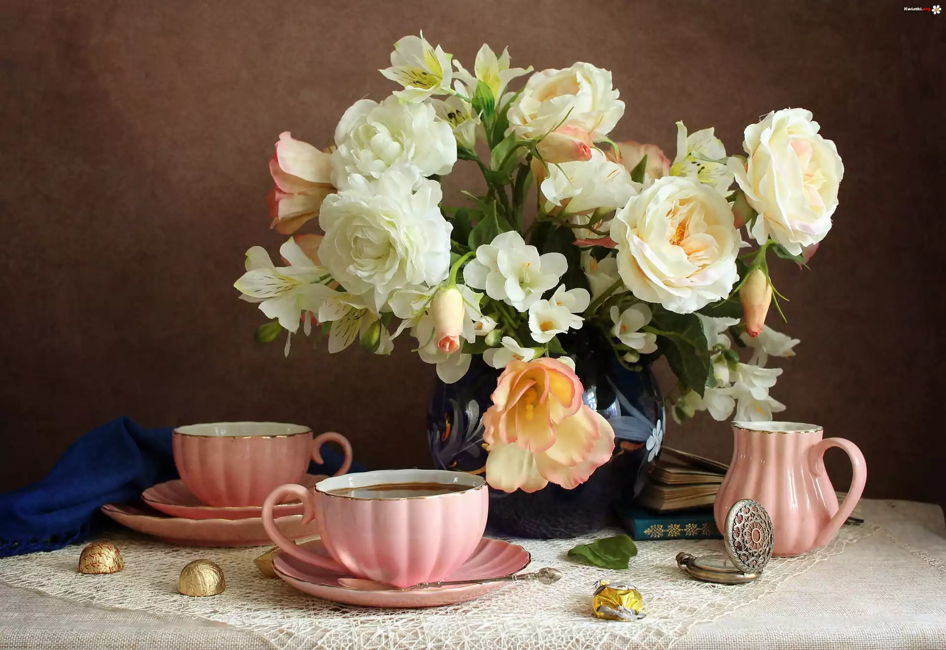 Kwiat Bukiet, Alstremeria, Wazon, Róże, Różowe, Filiżanki, Książki