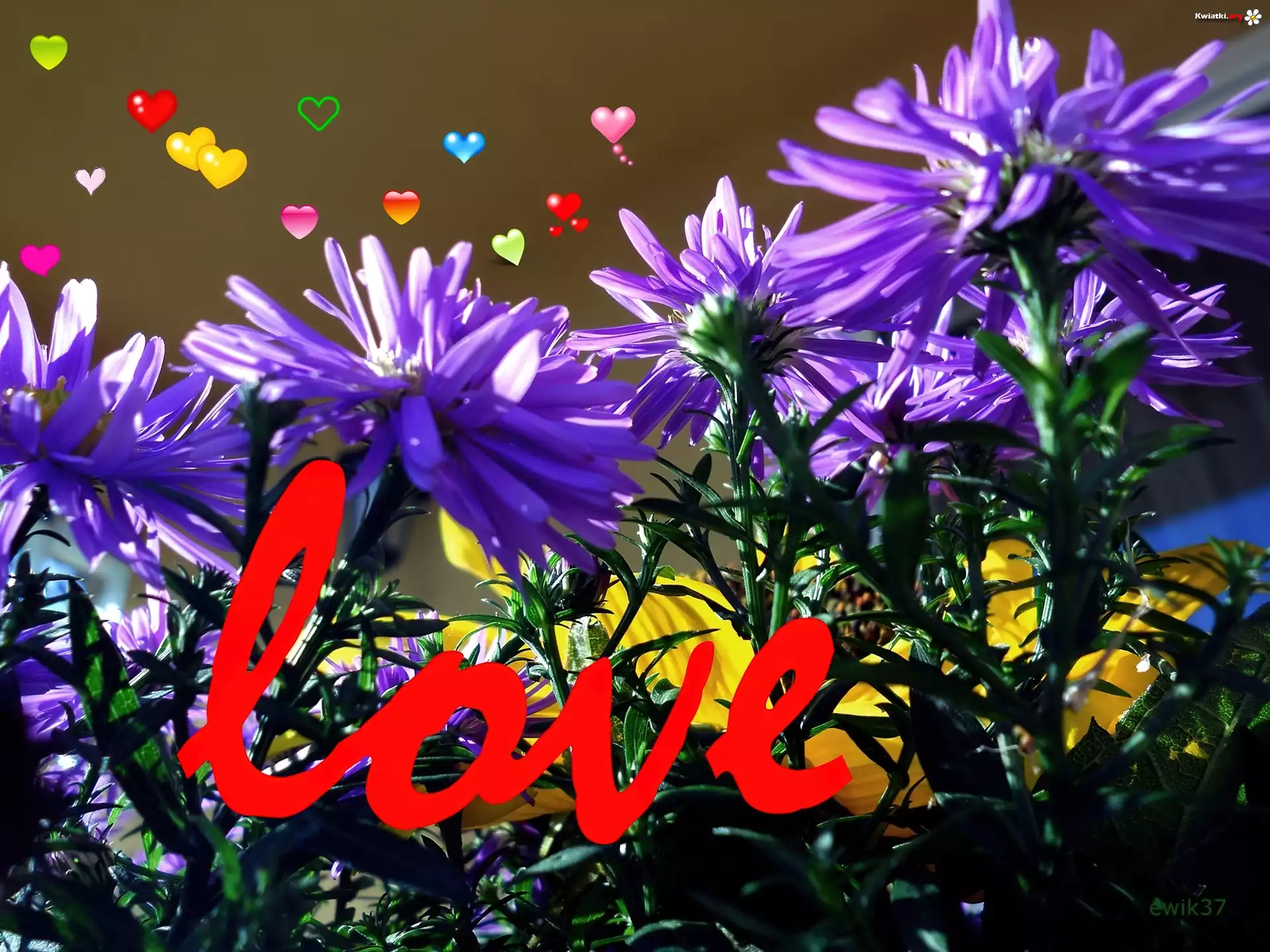 Kwiaty, Astry, Napis - Zdjęcia