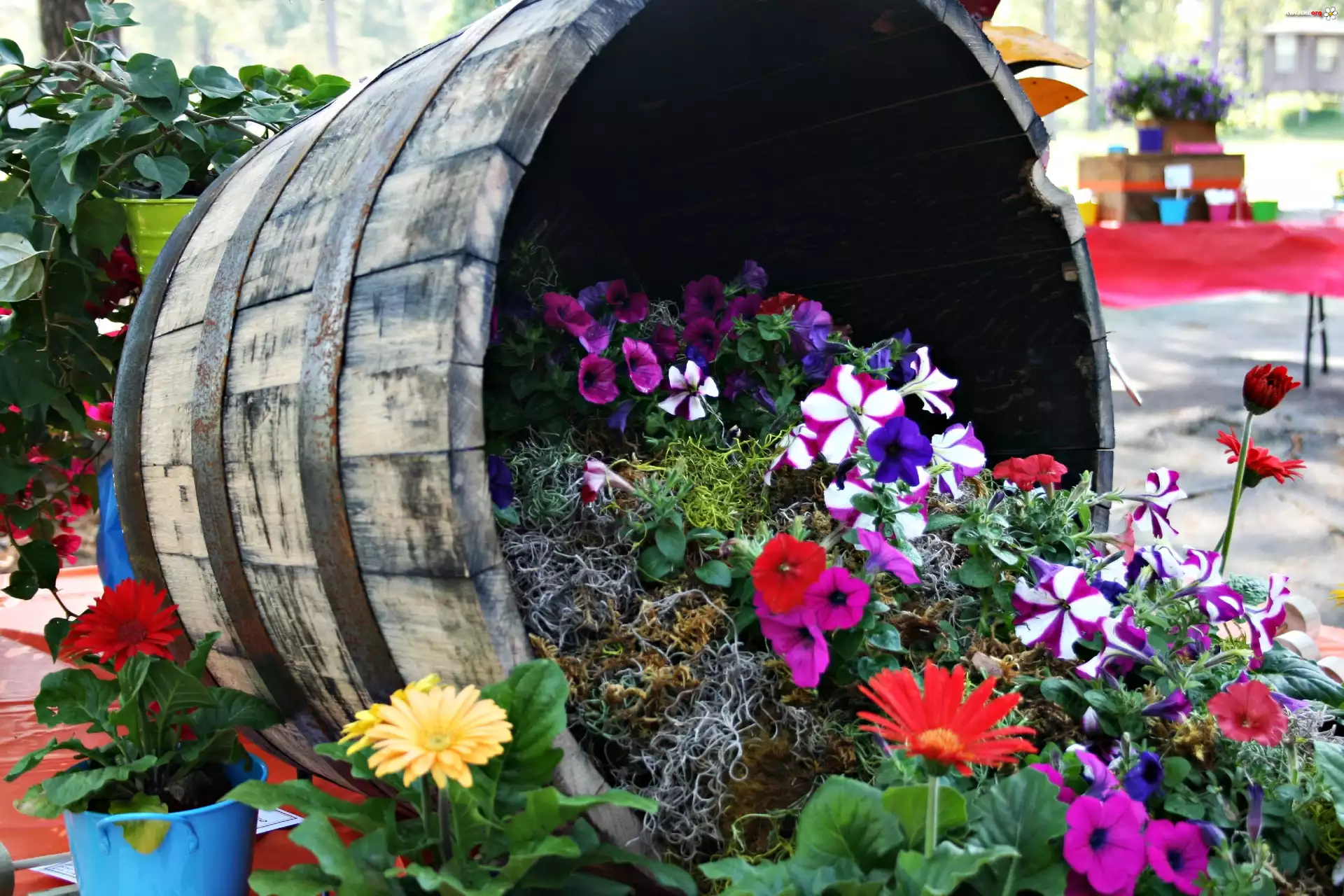 Beczka, Kompozycja, Kwiatowa, Gerbery, Petunie - Zdjęcia