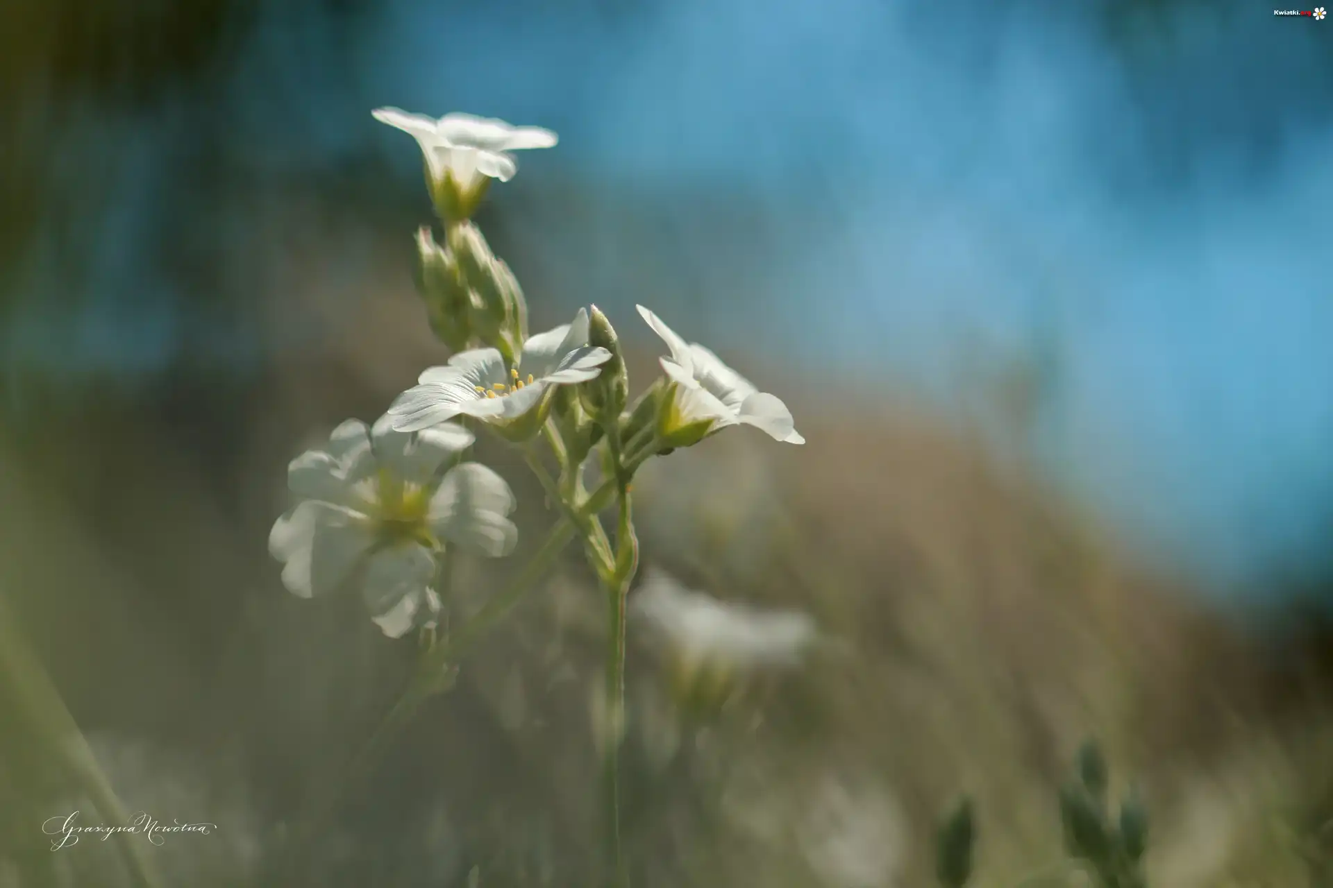 Bukiet, Białe, Kwiaty, Wazon, Rogownica polna Biały, Kwiat, Pręciki, Rogownica, Makro Białe, Drobne, Kwiatki, Rogownica
