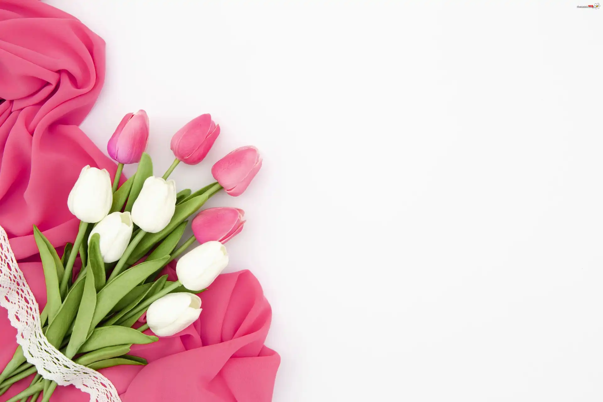 Kwiat Kwiaty, Białe, Różowe, Tulipany, Wstążka, Materiał, Białe, Tło