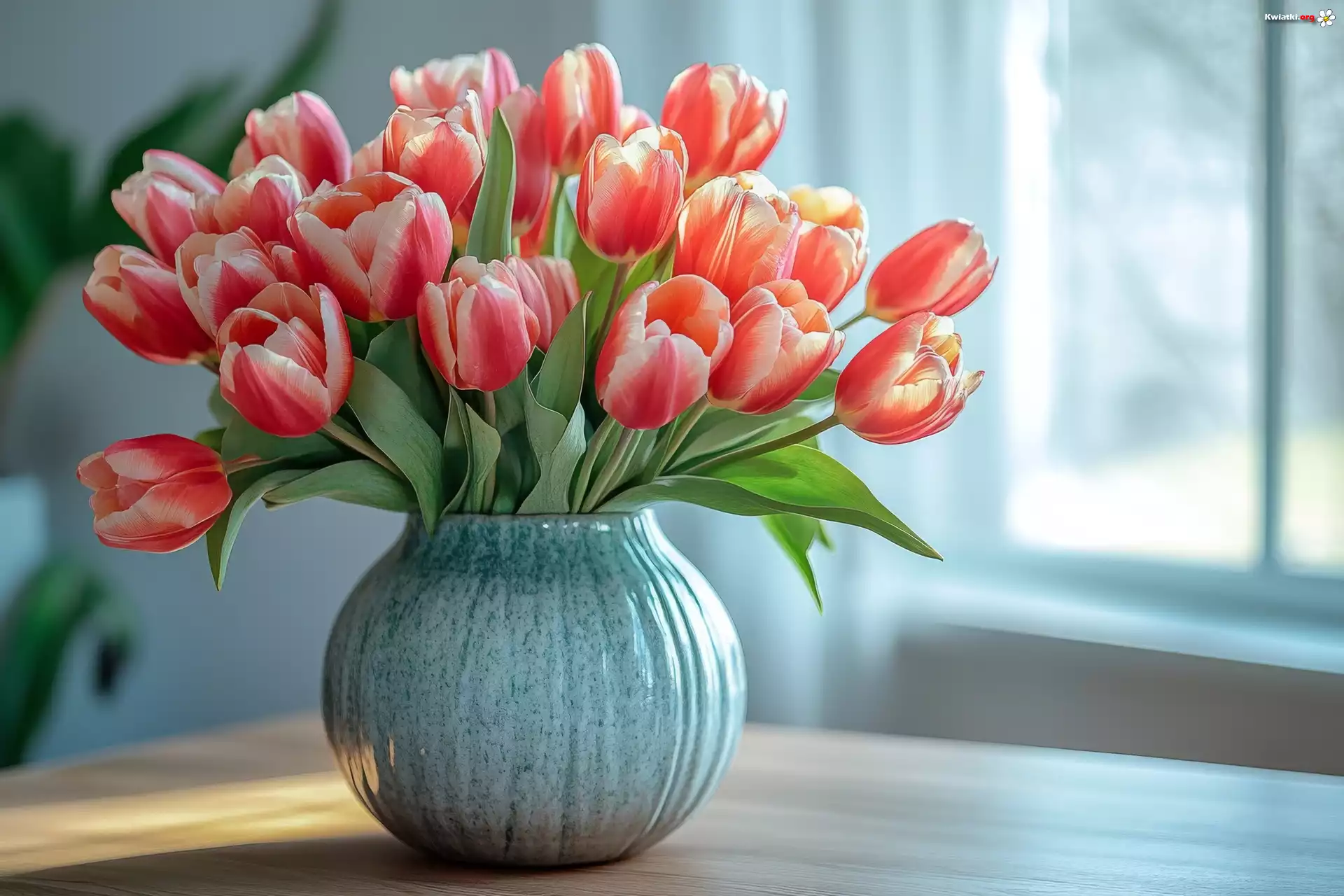 Kwiat Czerwono-białe, Tulipany, Wazon, Okno