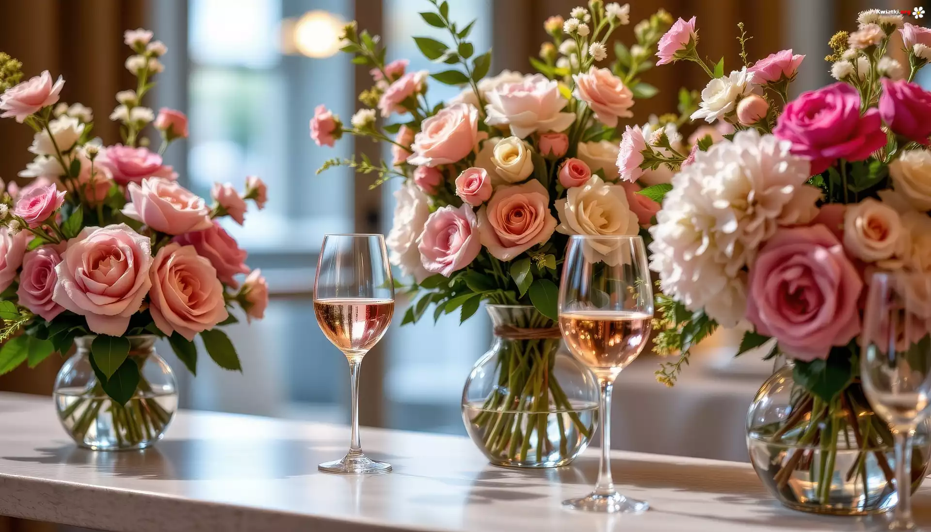 Róże, Bukiety, Kieliszki, Blat, Grafika AI - Zdjęcia