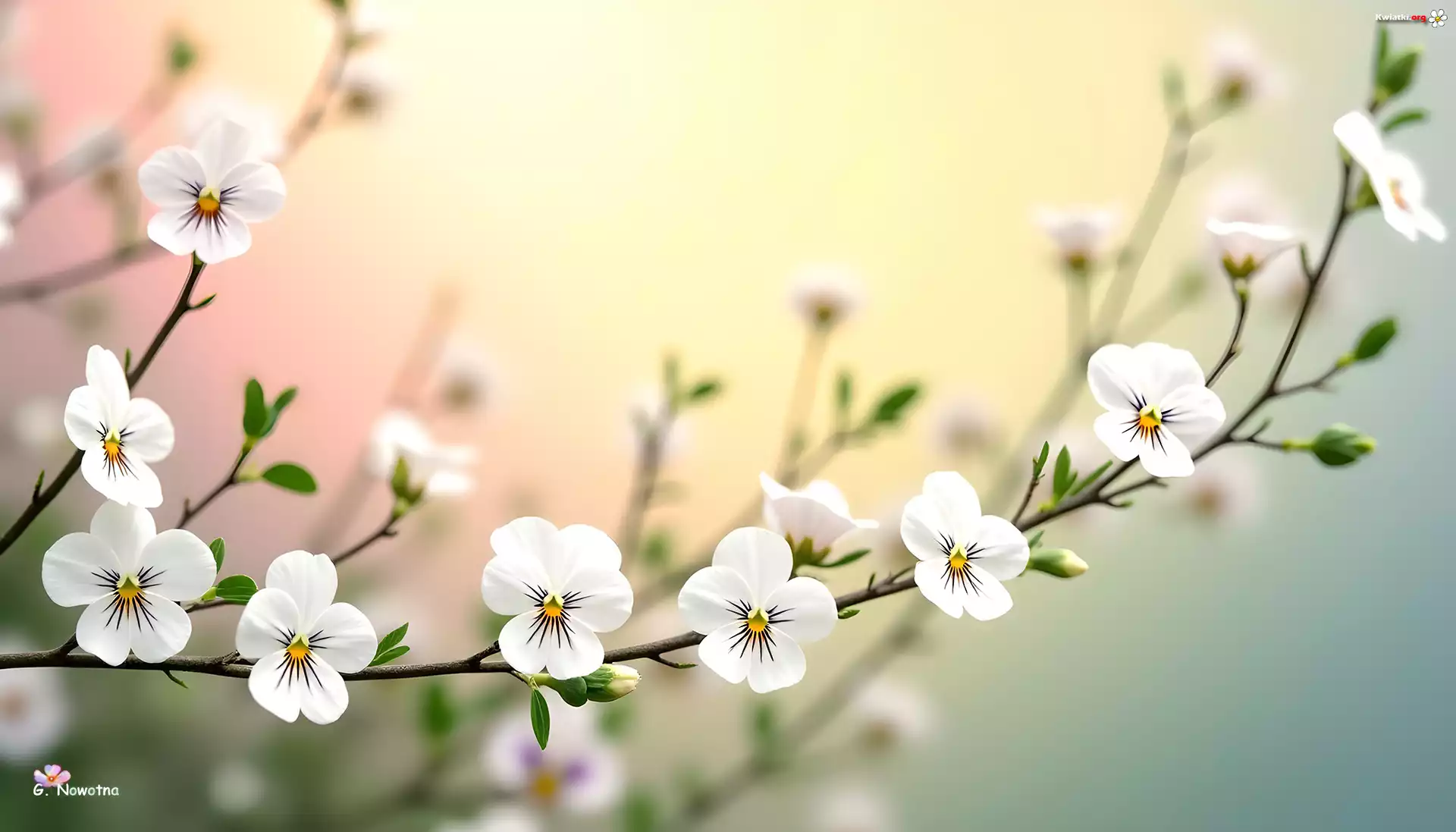 Białe, Bratki, Kwiaty, Gałązka, Grafika - Zdjęcia