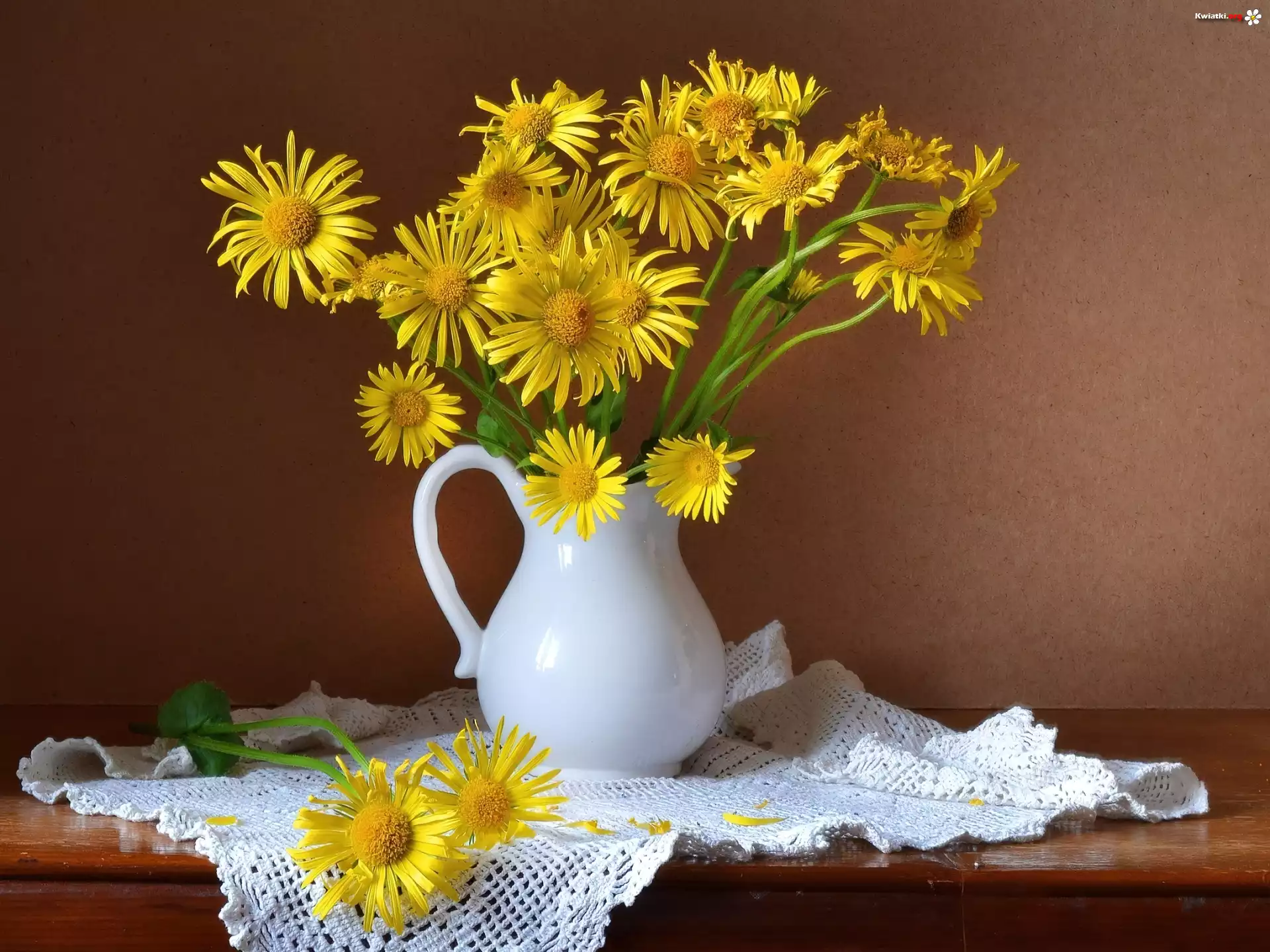 Bukiecik, Żółtych, Kwiatów, Dzbanek, Serweta, Kompozycja - Zdjęcia