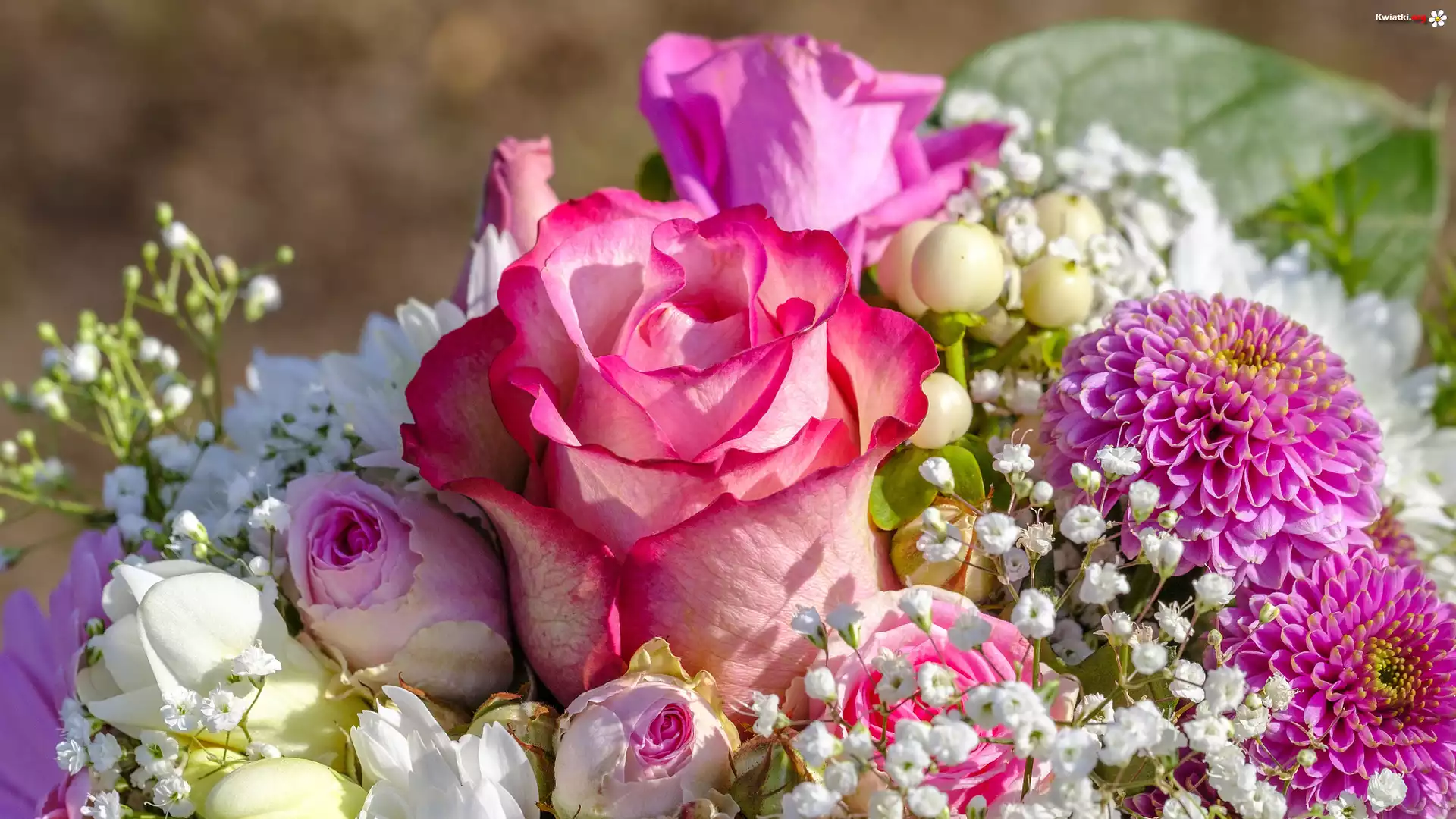 Bukiet, Kwiaty, Róże, Dalie, Gipsówka - Zdjęcia