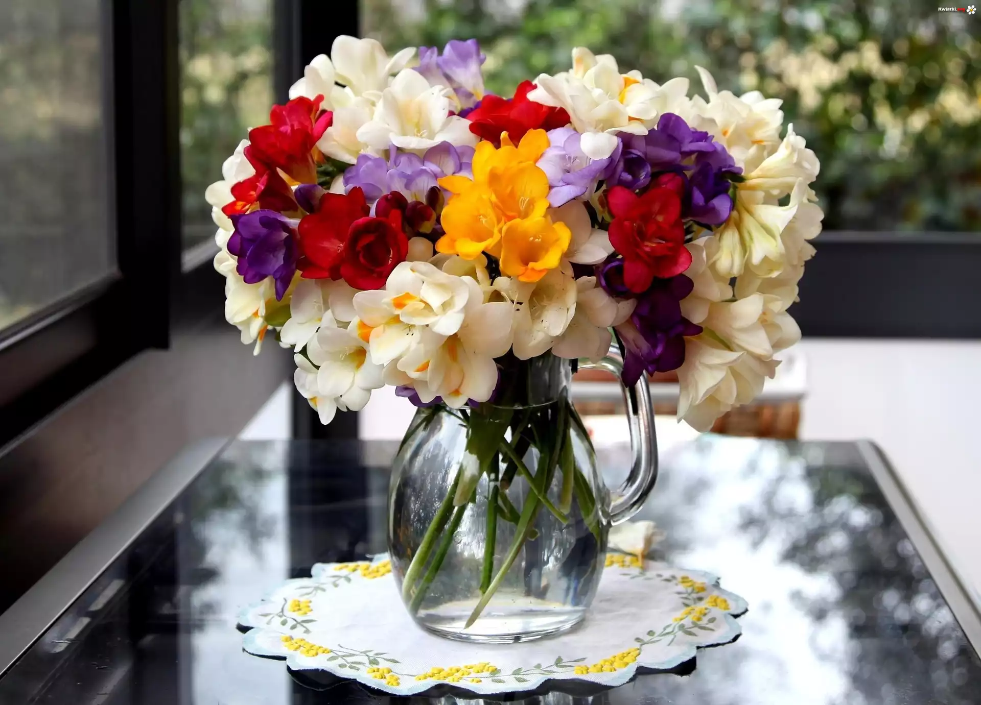 Kwiat Bukiet, Kwiaty, Frezje, Dzbanek, Serwetka