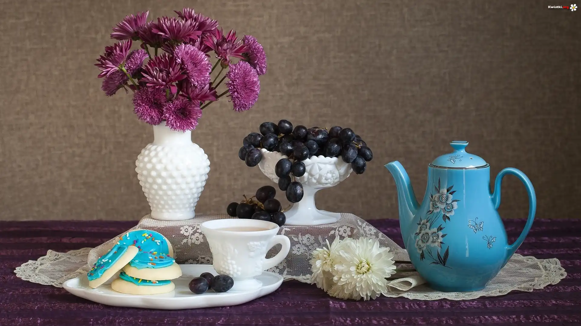 Kwiat Kompozycja, Bukiet, Astry, Dzbanek, Winogrona, Filiżanka, Ciasteczka