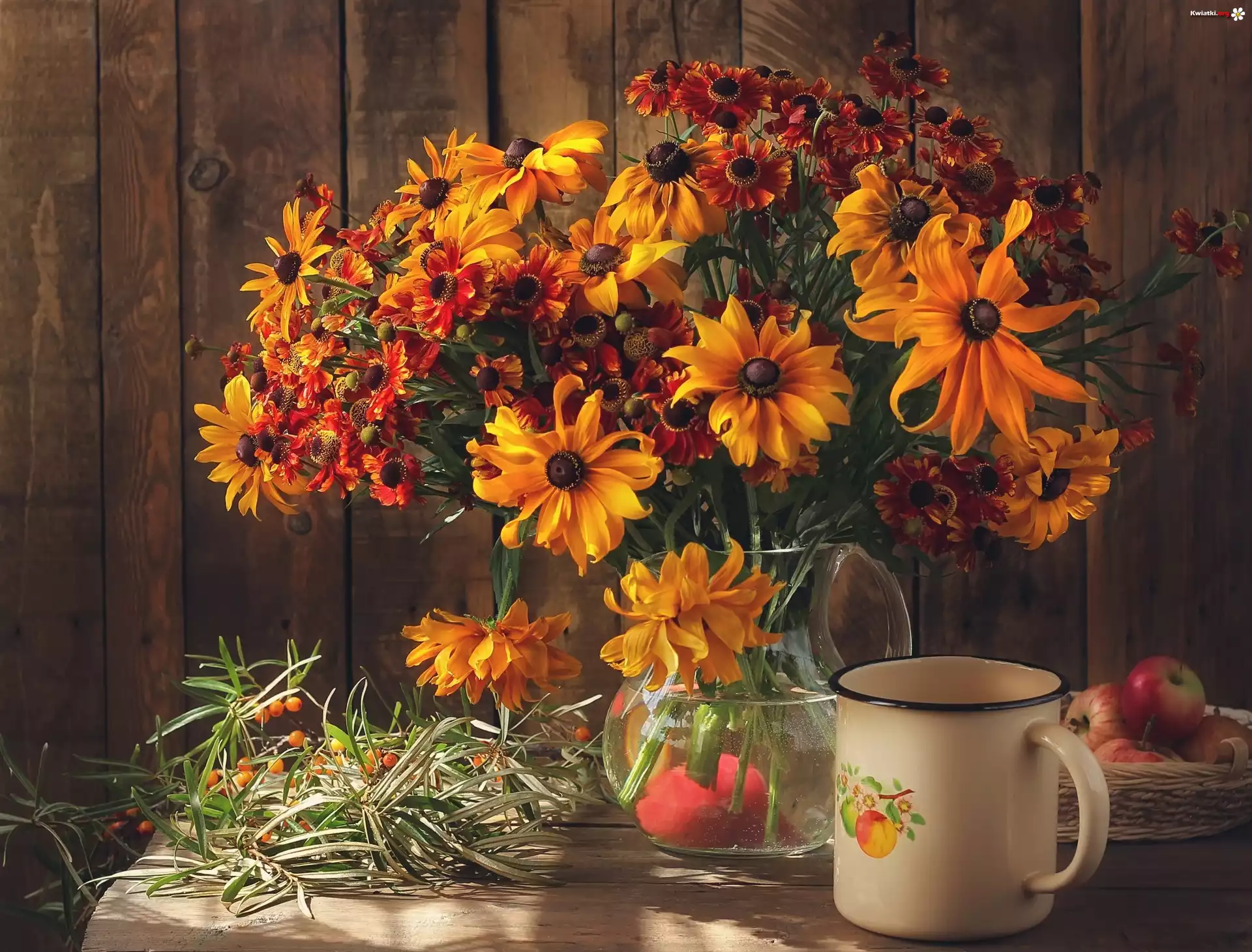 Kompozycja, Bukiet, Kwiatów, Rudbekia, Dzielżan, Jabłka, Garnuszek - Zdjęcia