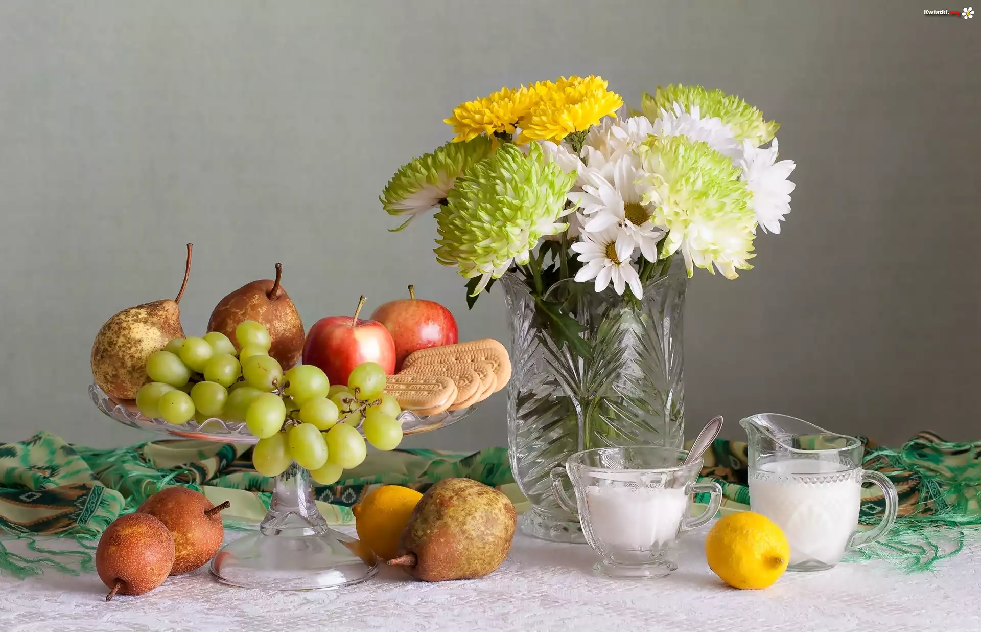 Kompozycja, Bukiet, Chryzantemy, Flakon, Owoce, Jabłka, Gruszki - Zdjęcia