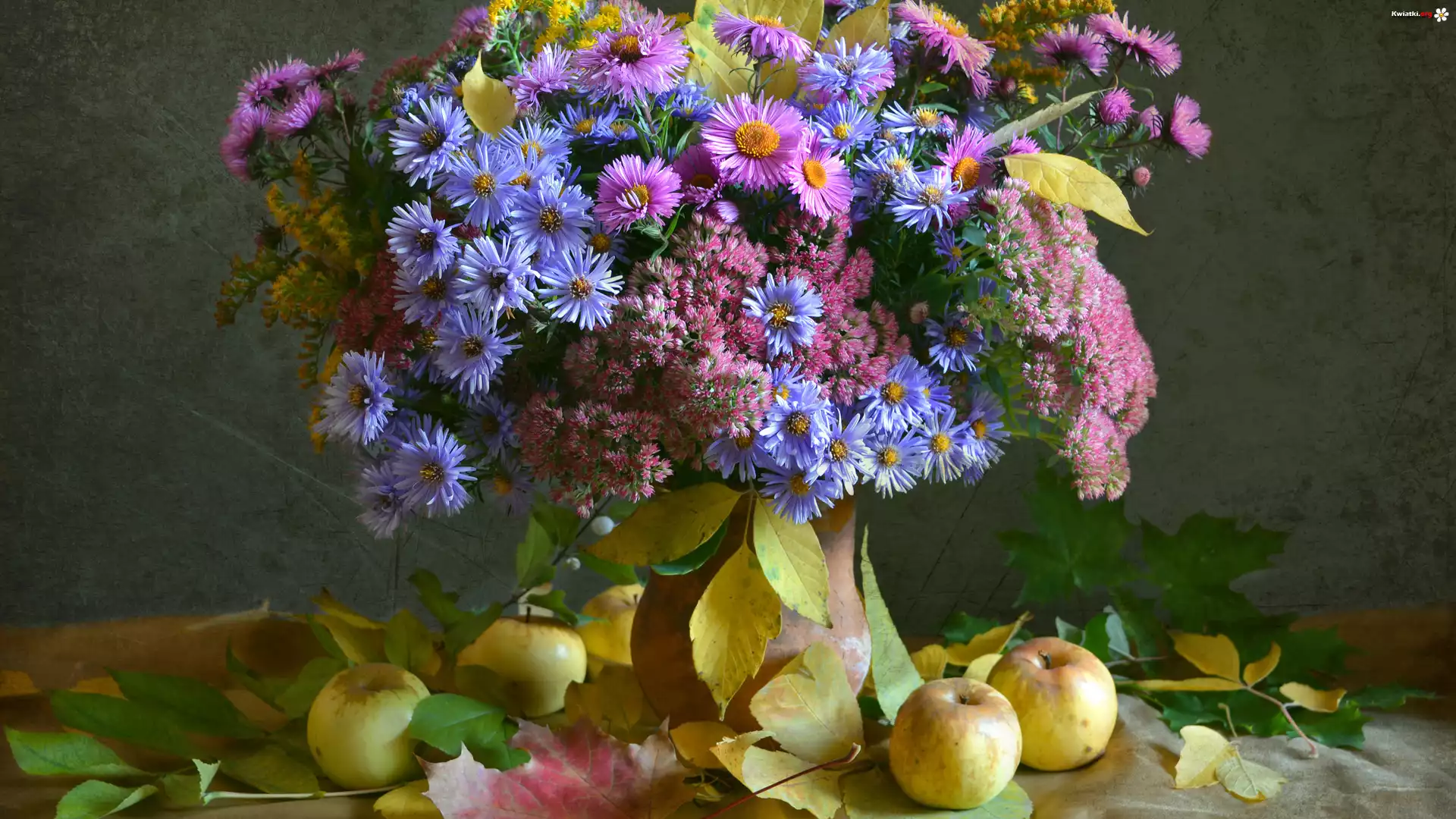Kompozycja, Bukiet, Kwiaty, Astry marcinki, Liście, Jabłka - Zdjęcia