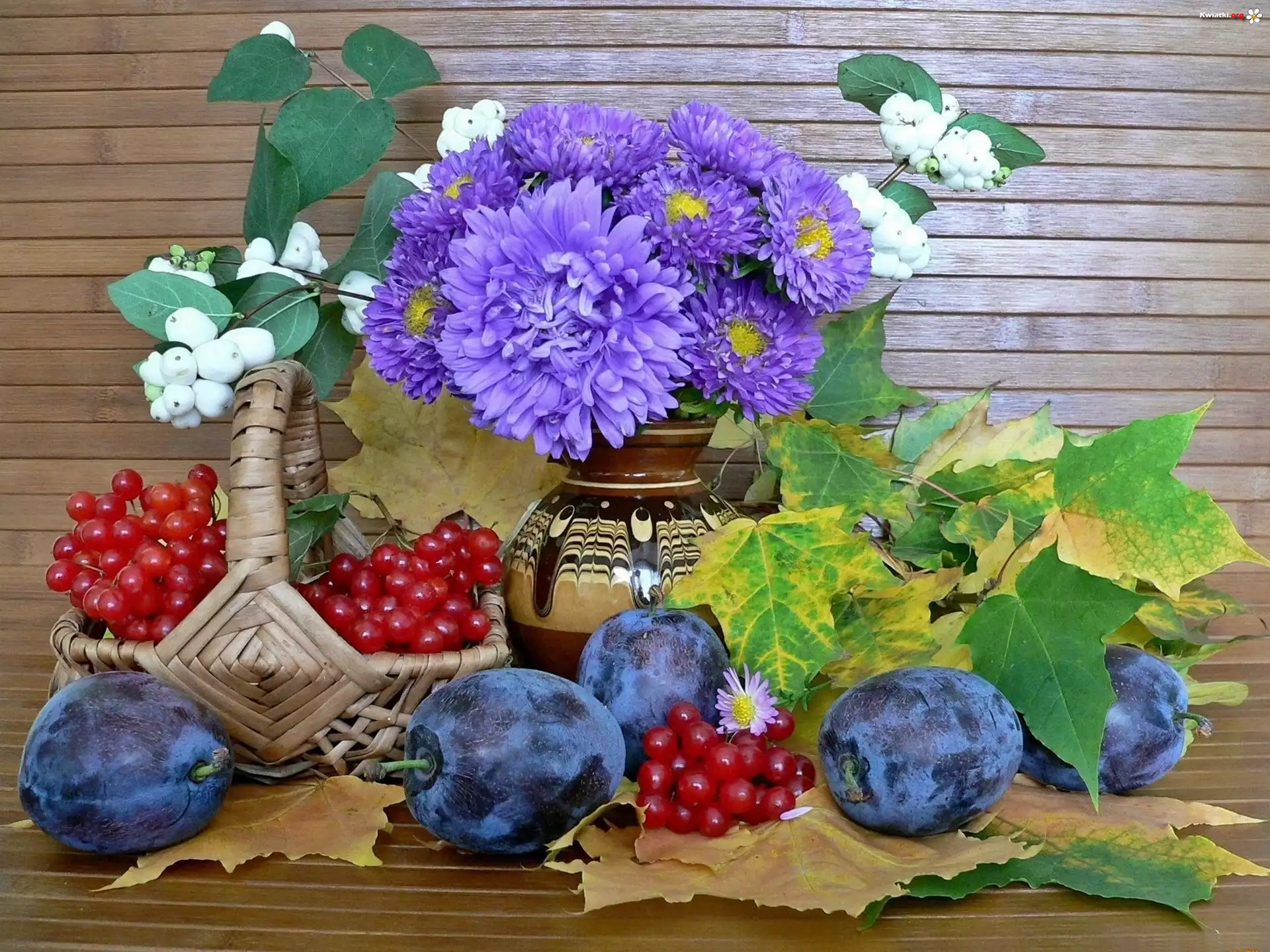 Bukiet, Astry, Śliwki, Porzeczki, Liście - Zdjęcia