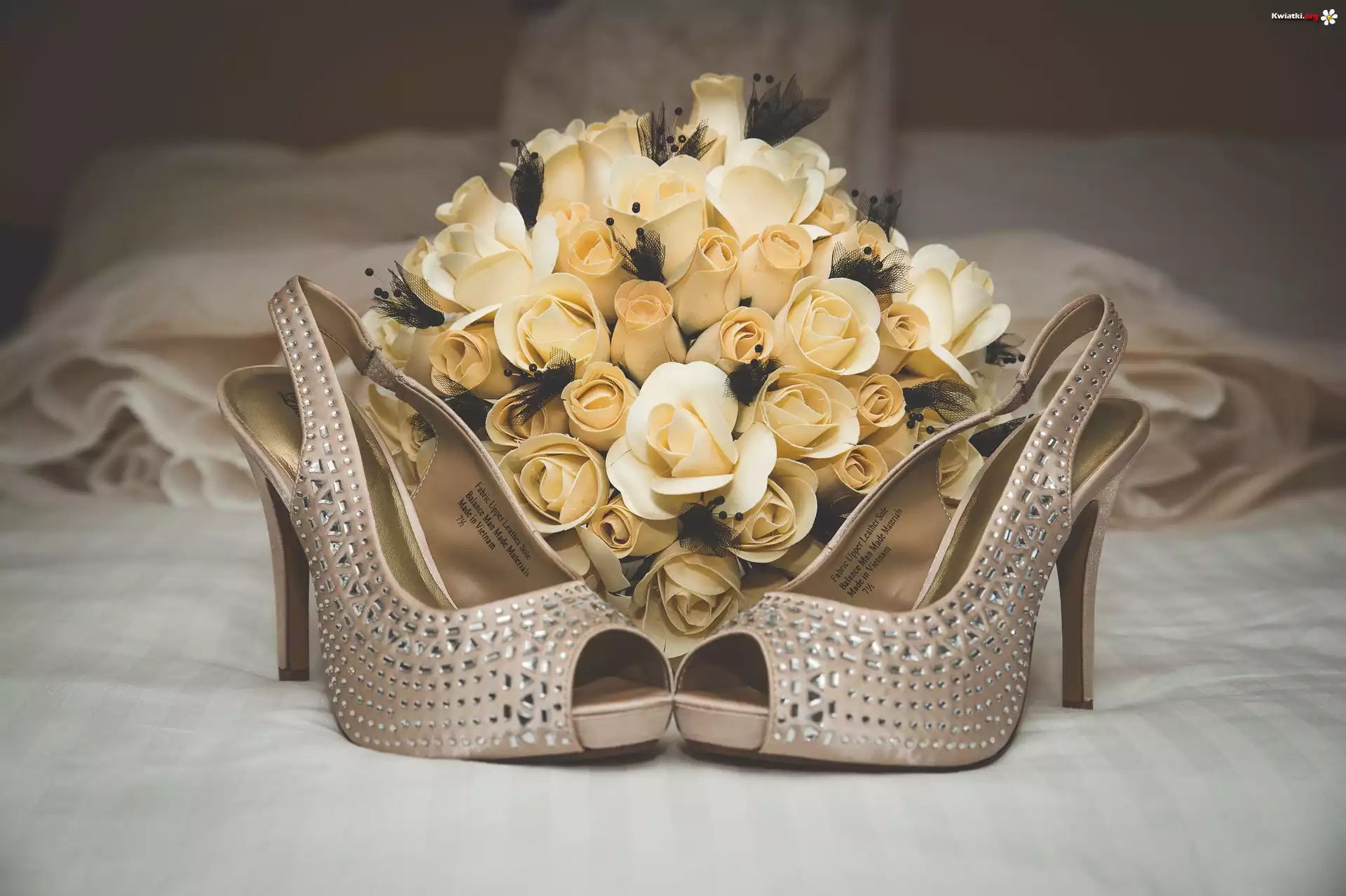 Bukiet, Kremowych, Róż, Pantofelki - Zdjęcia