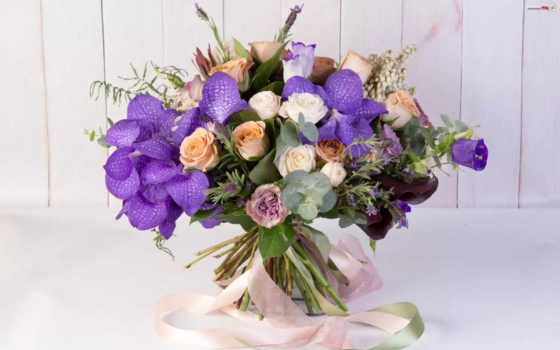 Bukiet, Kwiatów, Róże, Storczyki, Wstążka - Zdjęcia