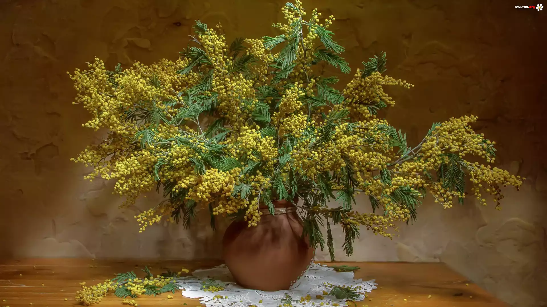 Bukiet, Gałązki, Akacja srebrzysta, Wazon, Serwetka - Zdjęcia