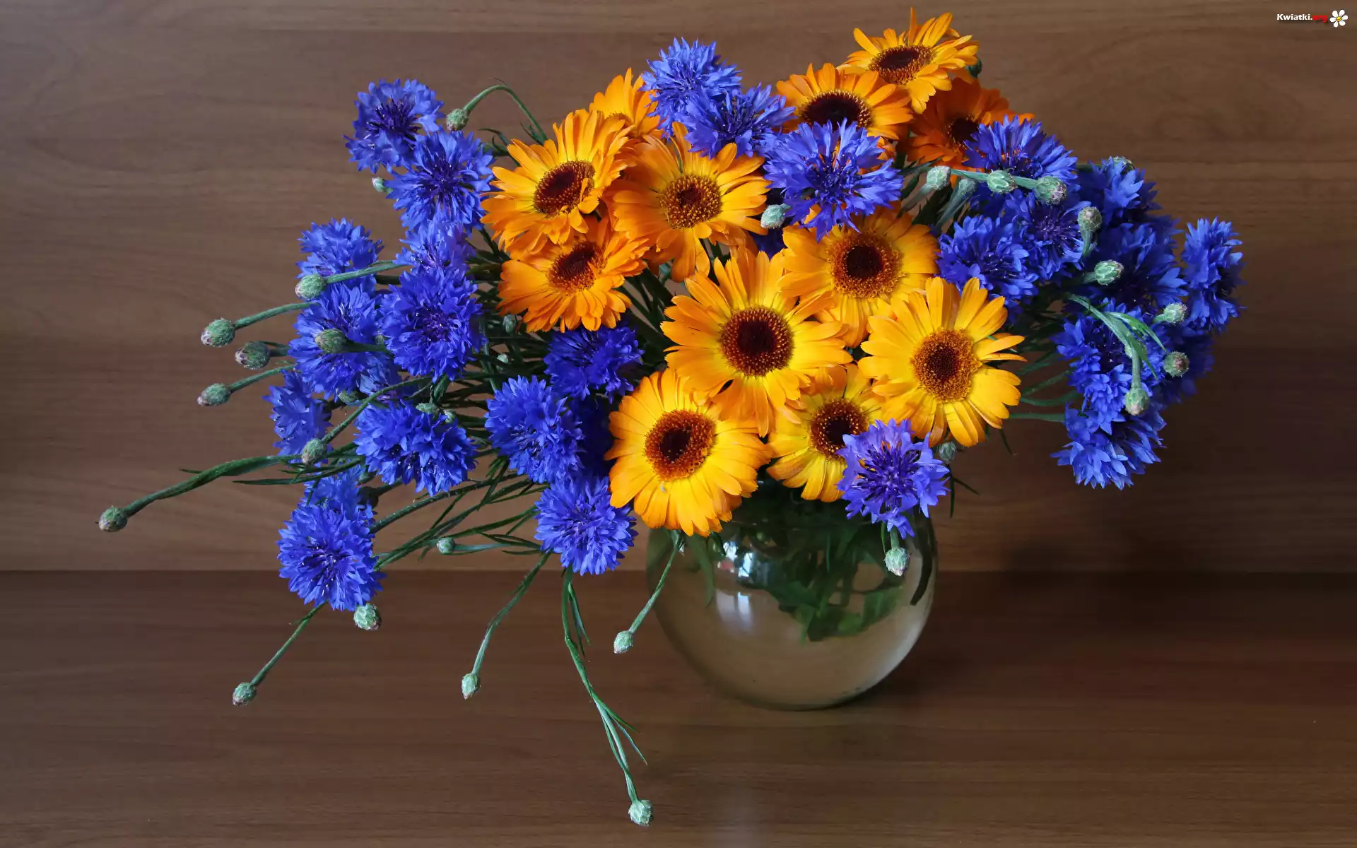 Kwiat Bukiet kwiatów, Chabry, Nagietek, Wazon, Deski