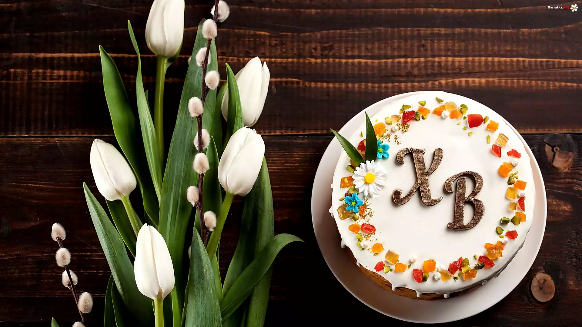 Ciasto, Polewa, Tulipany, Gałązki, Bazie, Deski - Zdjęcia