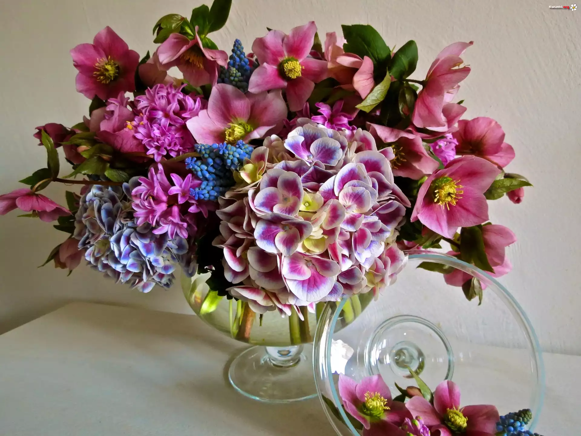 Ciemiernik, Hiacynty, Hortensja, Bukiet, Wazon - Zdjęcia
