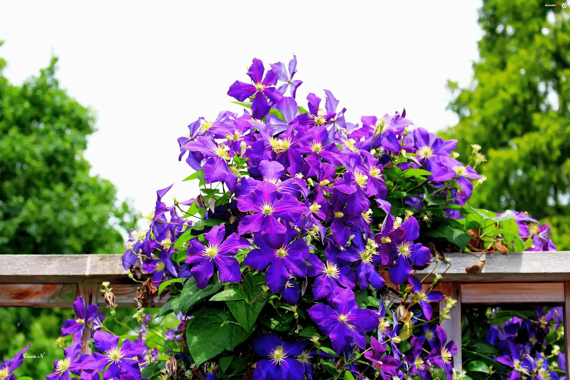 Clematis, Fioletowy, Płot, Drzewa, Liście, Lato - Zdjęcia