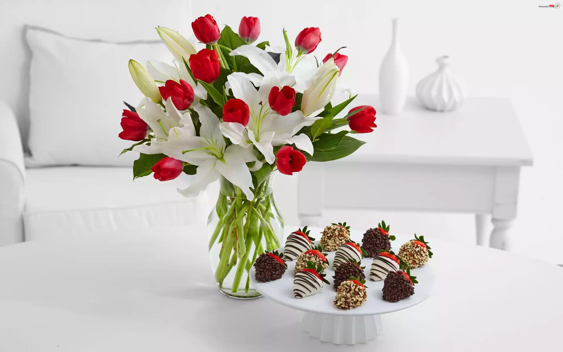 Kwiat Wazon, Bukiet, Kwiaty, Lilie, Tulipany, Patera, Owoce, Truskawki, Czekolada
