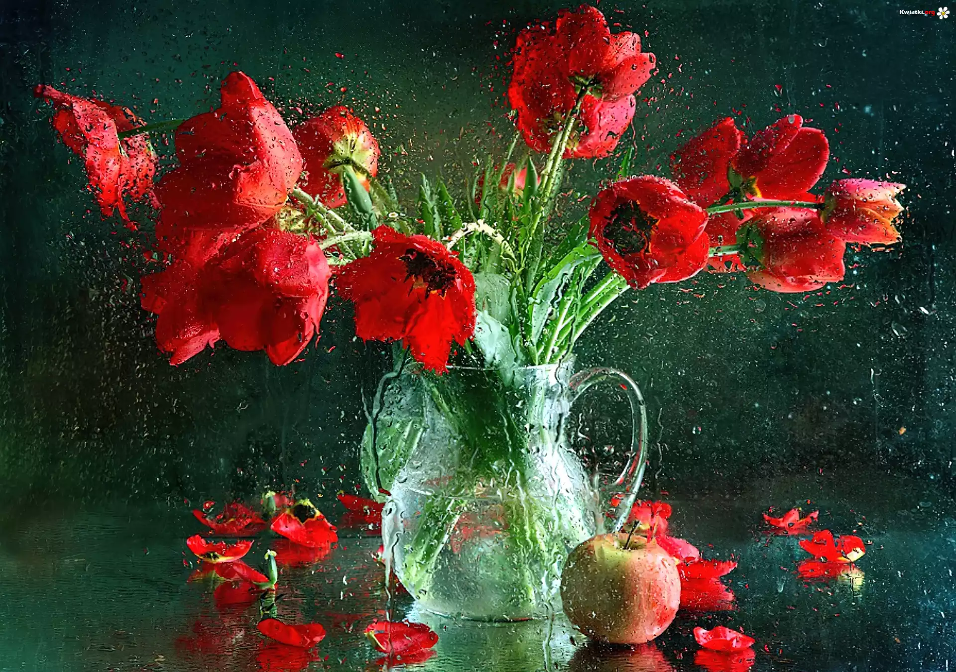 Czerwone, Tulipany, Wazon, Deszcz, Bukiet, Jabłko - Zdjęcia