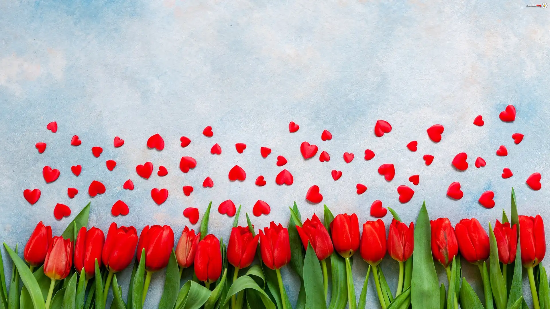 Kwiat Czerwone, Tulipany, Serduszka, Biało-niebieskie, Tło