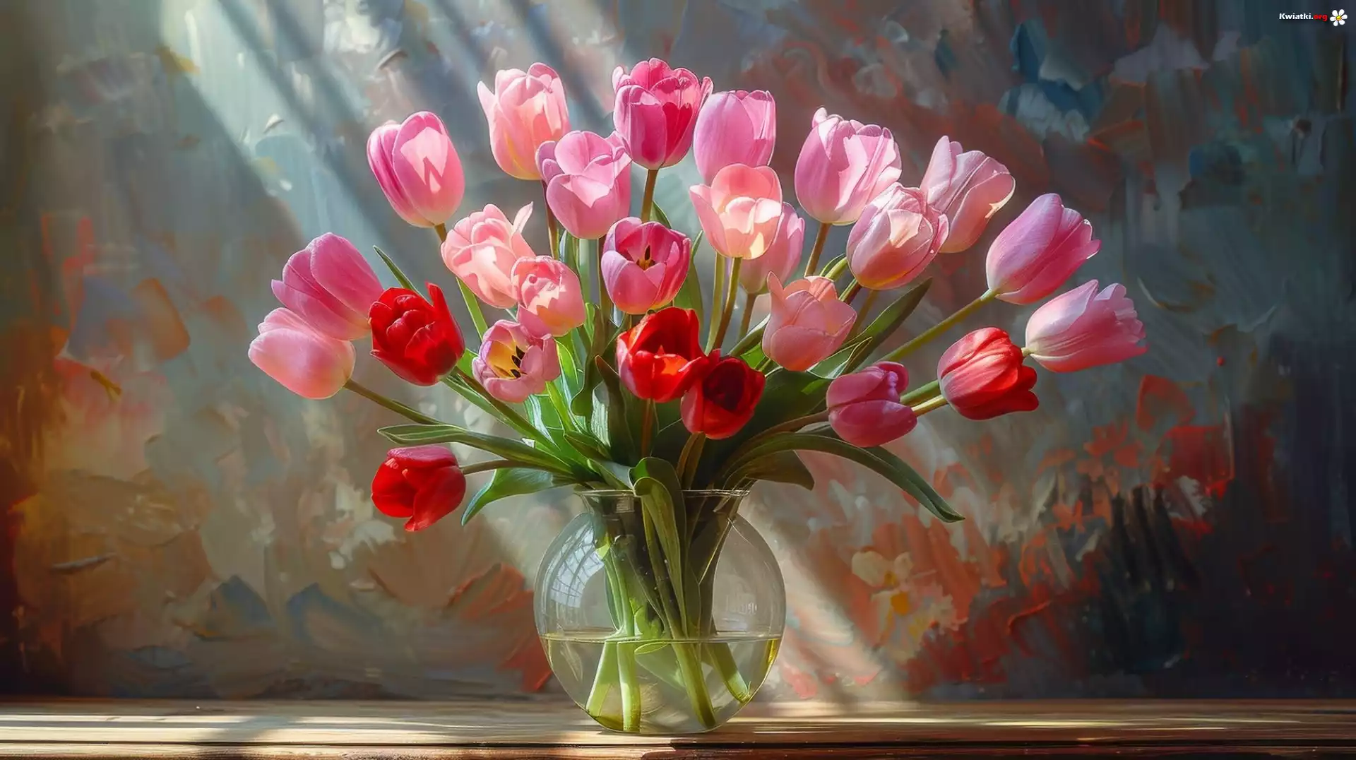Kwiat Kwiaty, Tulipany, Różowe, Czerwone, Bukiet, Wazon, Tło