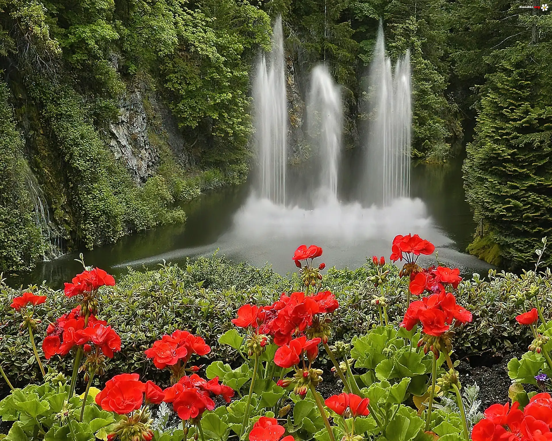 Czerwone, Kwiaty, Wodospad, Las - Zdjęcia