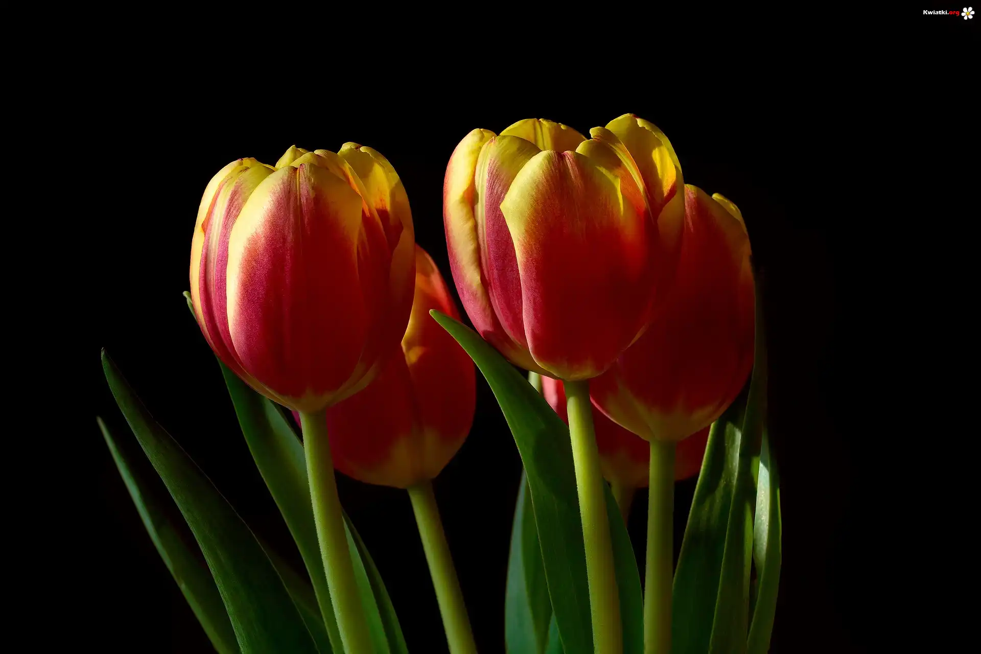Kwiat Czerwono-żółte, Tulipany, Ciemne tło