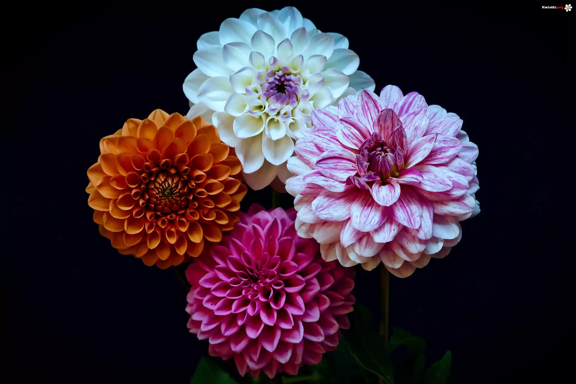 Cztery, Kolorowe, Kwiaty, Dalie, Ciemne, Tło - Zdjęcia