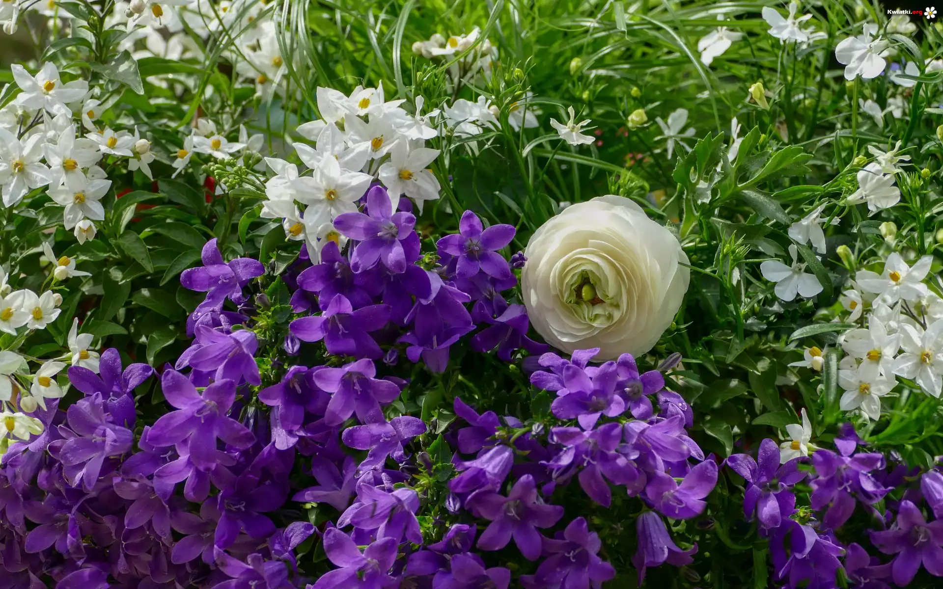 Kwiaty, Fioletowe, Dzwonki dalmatyńskie, Psianki jaśminowe, Jaskier Dzwonek dalmatyński - Zdjęcia