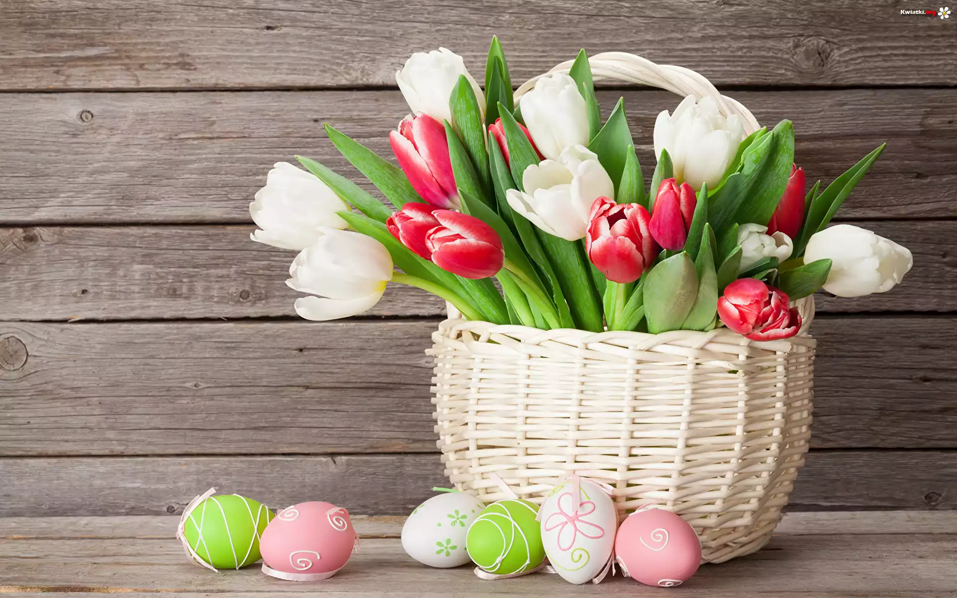 Kwiat Biały, Koszyk, Kwiaty, Białe, Czerwone, Tulipany, Pisanki, Deski