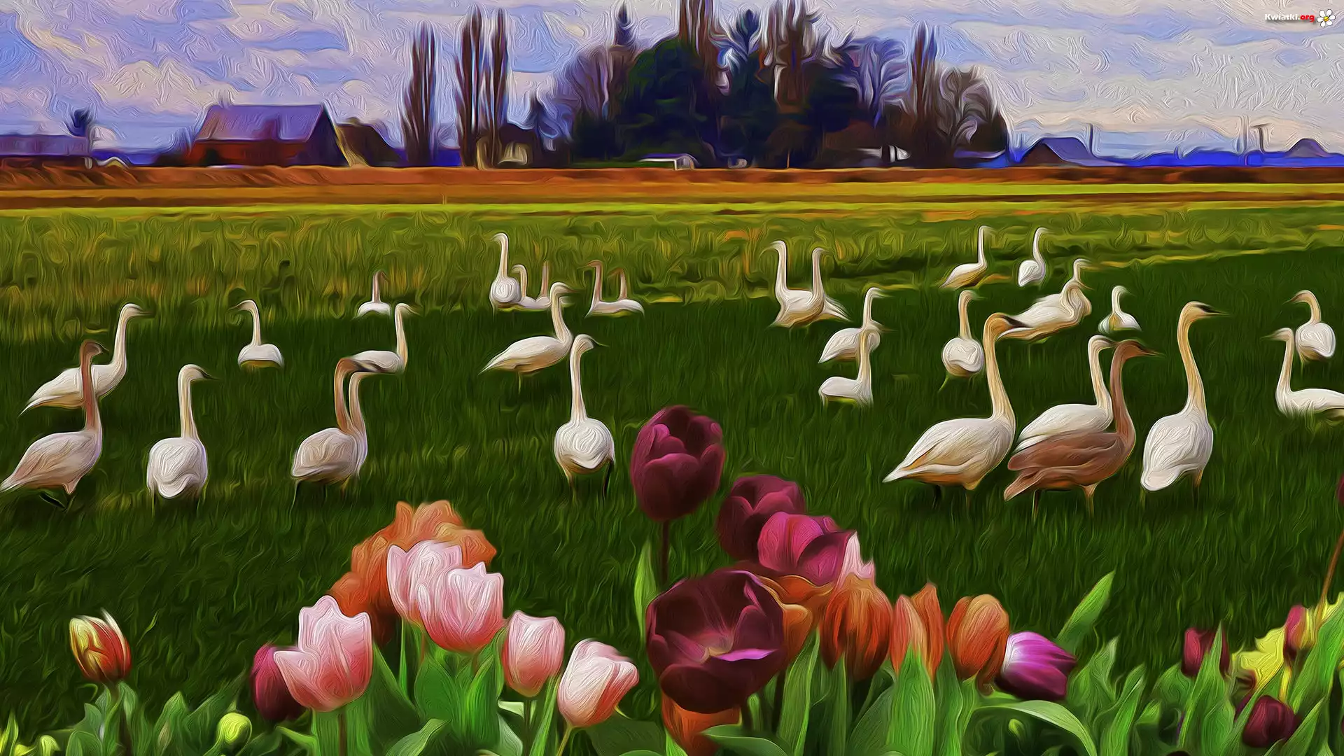 Domy, Drzewa, Łąka, Trawa, Ptaki, Kwiaty, Kolorowe, Tulipany, Grafika - Zdjęcia