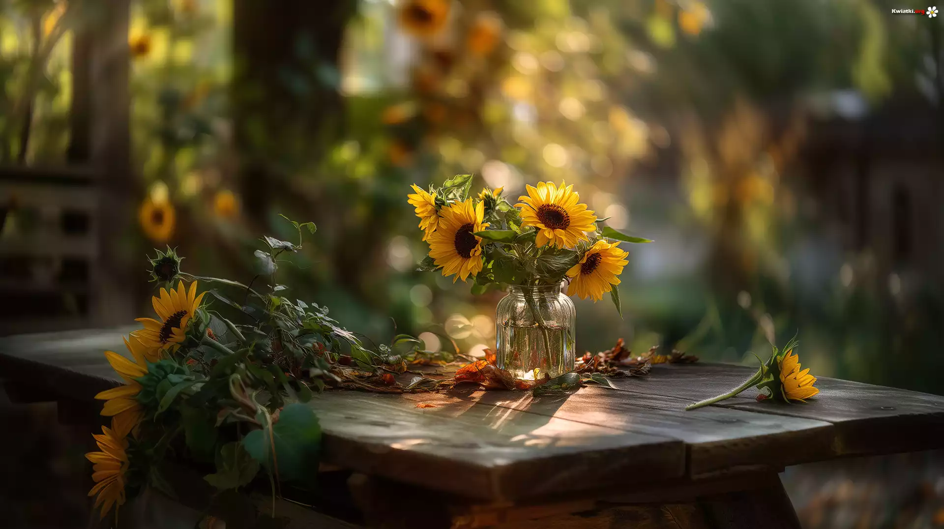 Kwiat Słoneczniki ozdobne, Wazon, Drewniany, Stół, Grafika AI
