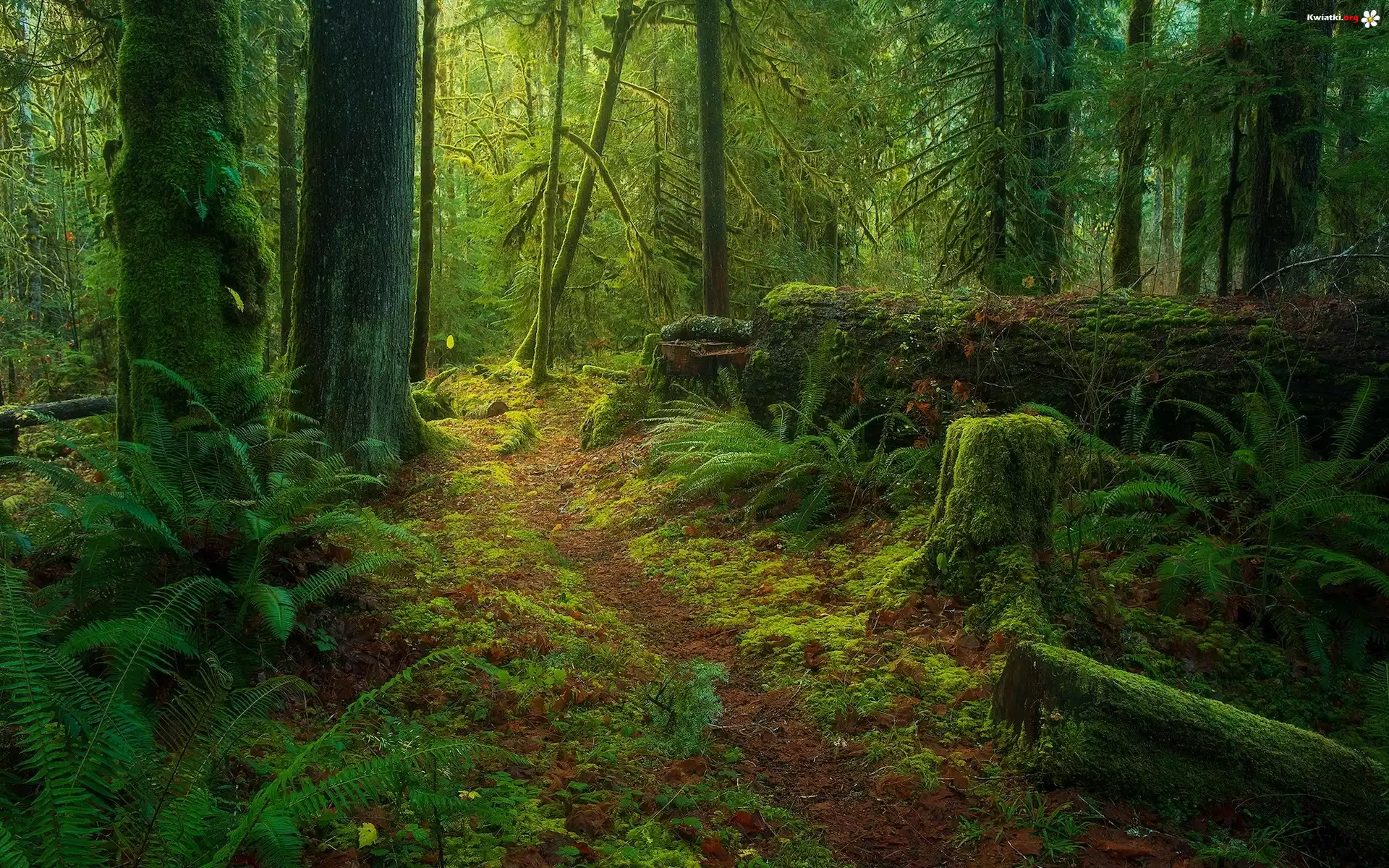 Kwiat Las, Drzewa, Omszałe, Paprocie, Ścieżka