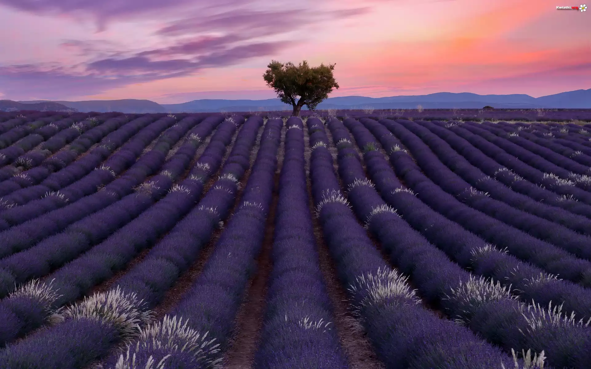 Kwiat Pole, Kwiaty, Lawenda, Drzewo, Zachód słońca