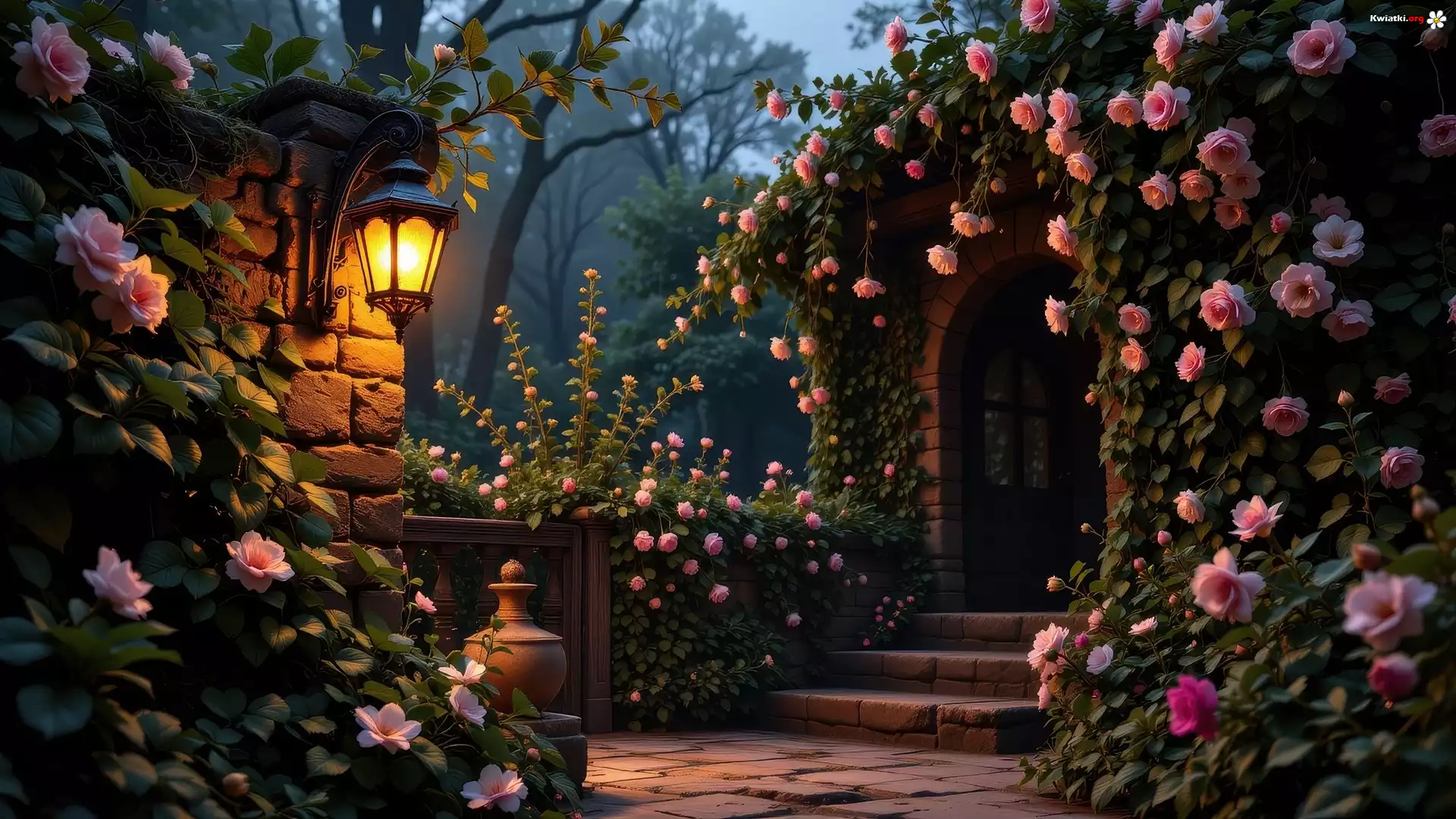 Ogród, Świecący, Lampa, Mur, Różowe, Kwiaty, Schody, Drzwi - Zdjęcia