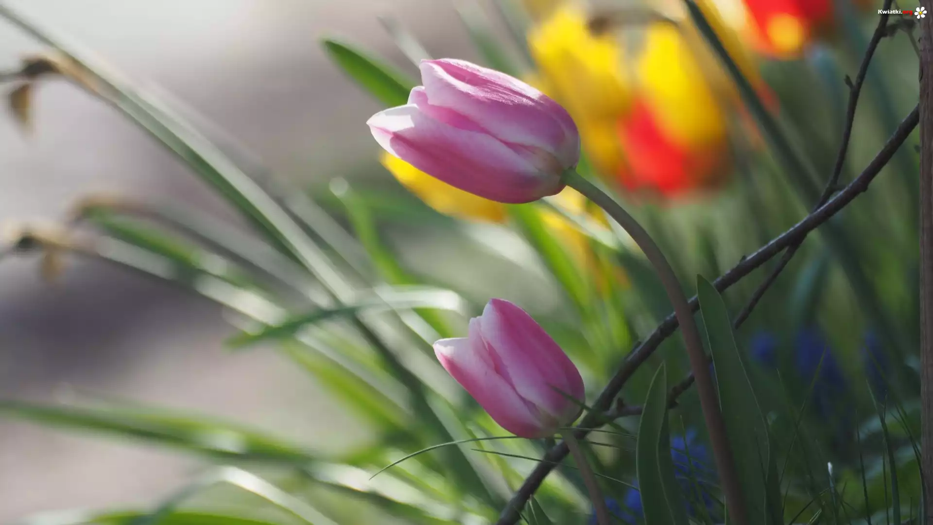 Kwiat Dwa, Różowe, Tulipany, Rozmyte, Tło