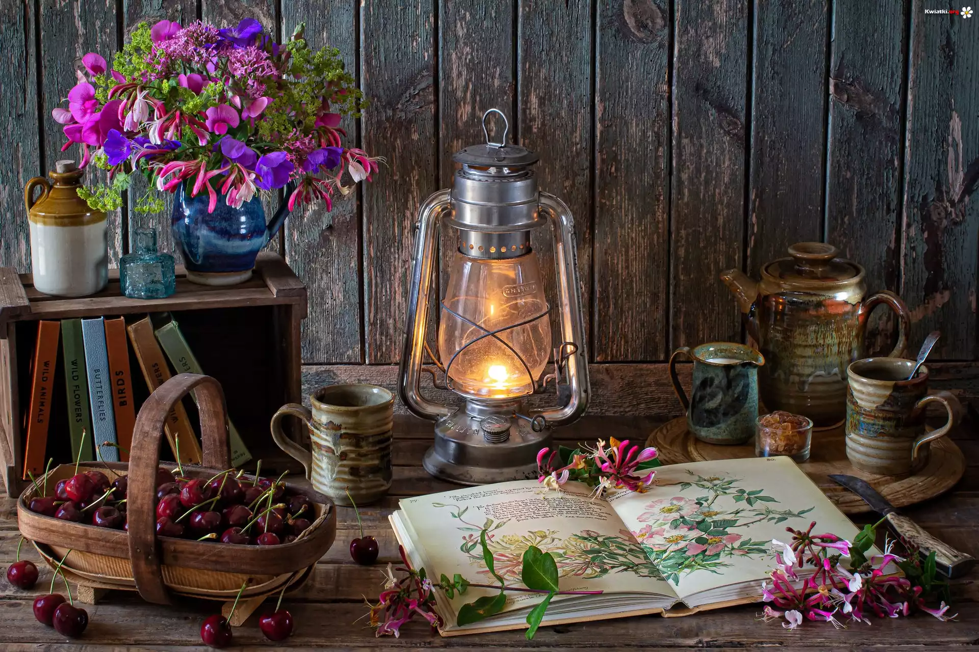 Kwiat Kompozycja, Bukiet kwiatów, Lampa, Książka, Koszyk, Czereśnie, Kubki, Dzbanek