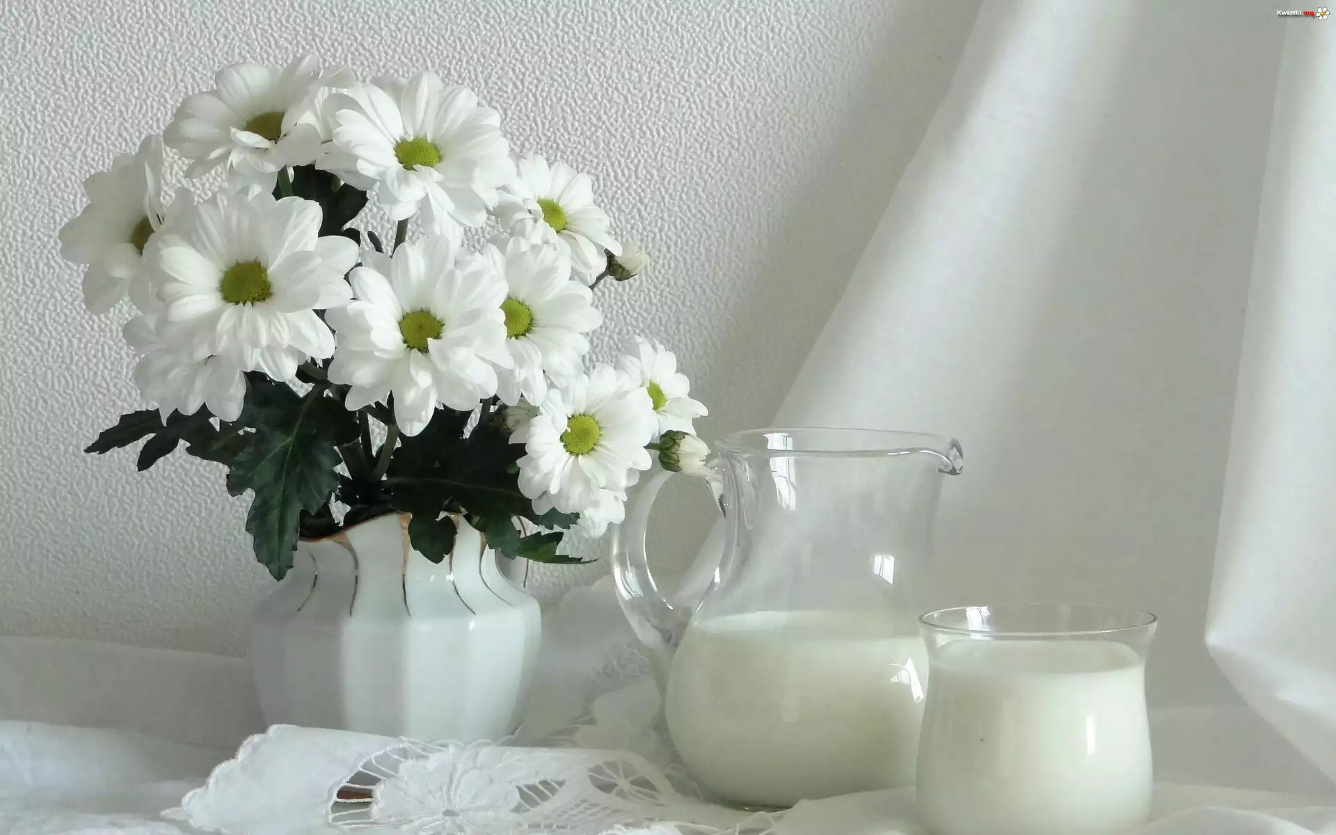 Dzbanek, Biały, Bukiet, Kwiatów, Mleko, Serwetka - Zdjęcia