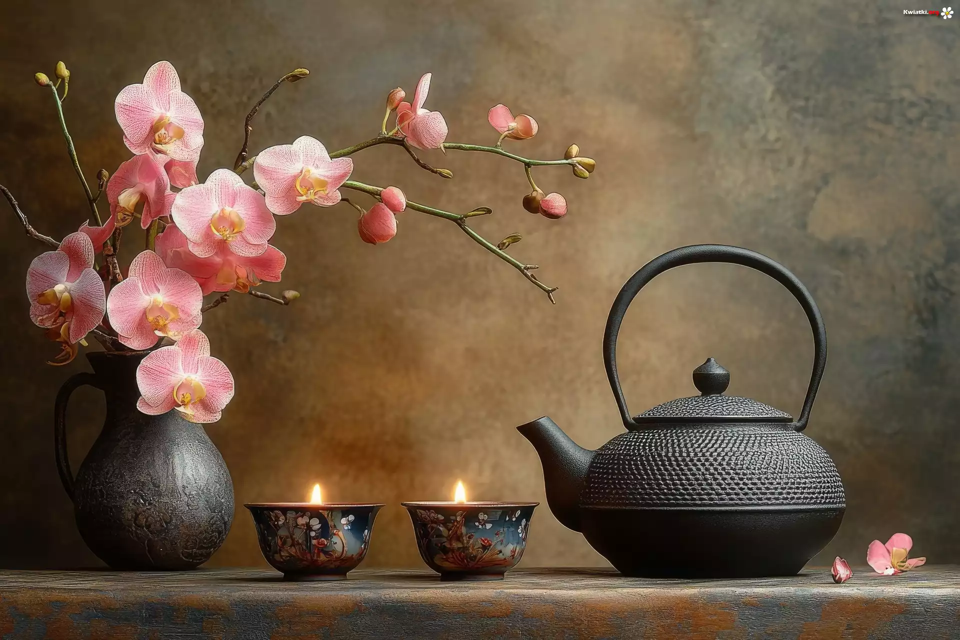 Kwiaty, Storczyki, Różowe, Dzbanek, Świece, Czajnik, Kompozycja - Zdjęcia