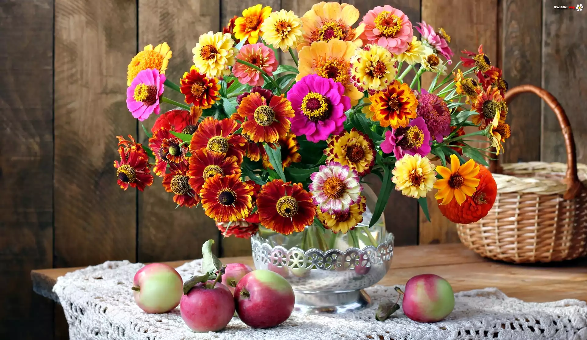 Kwiaty, Dzielżany, Cynie, Bukiet, Koszyk, Jabłka, Kompozycja - Zdjęcia