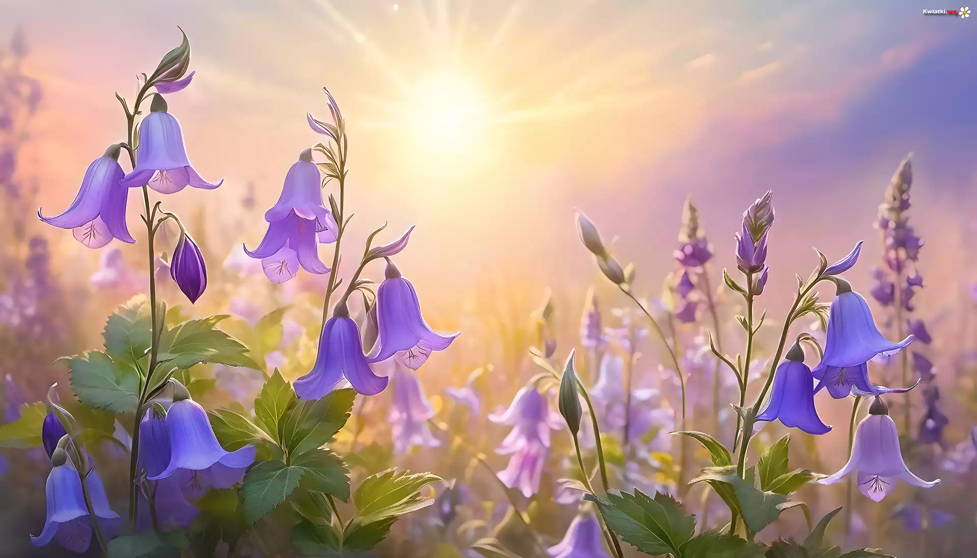 Kwiat Fioletowe, Dzwonki, Kwiaty, Słońce, Grafika