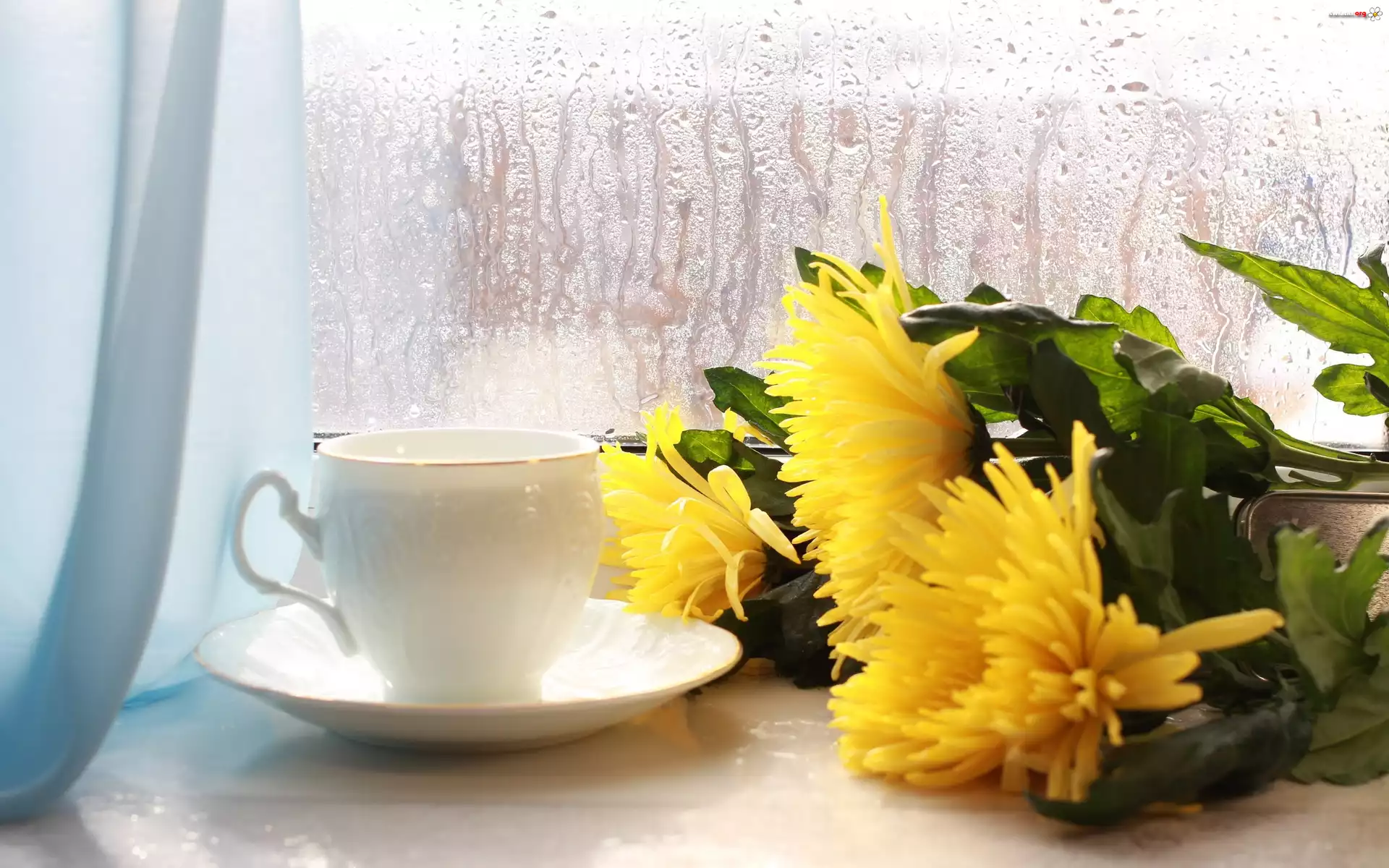Filiżanka, Herbaty, Bukiet, Kwiatów, Okno, Deszcz - Zdjęcia