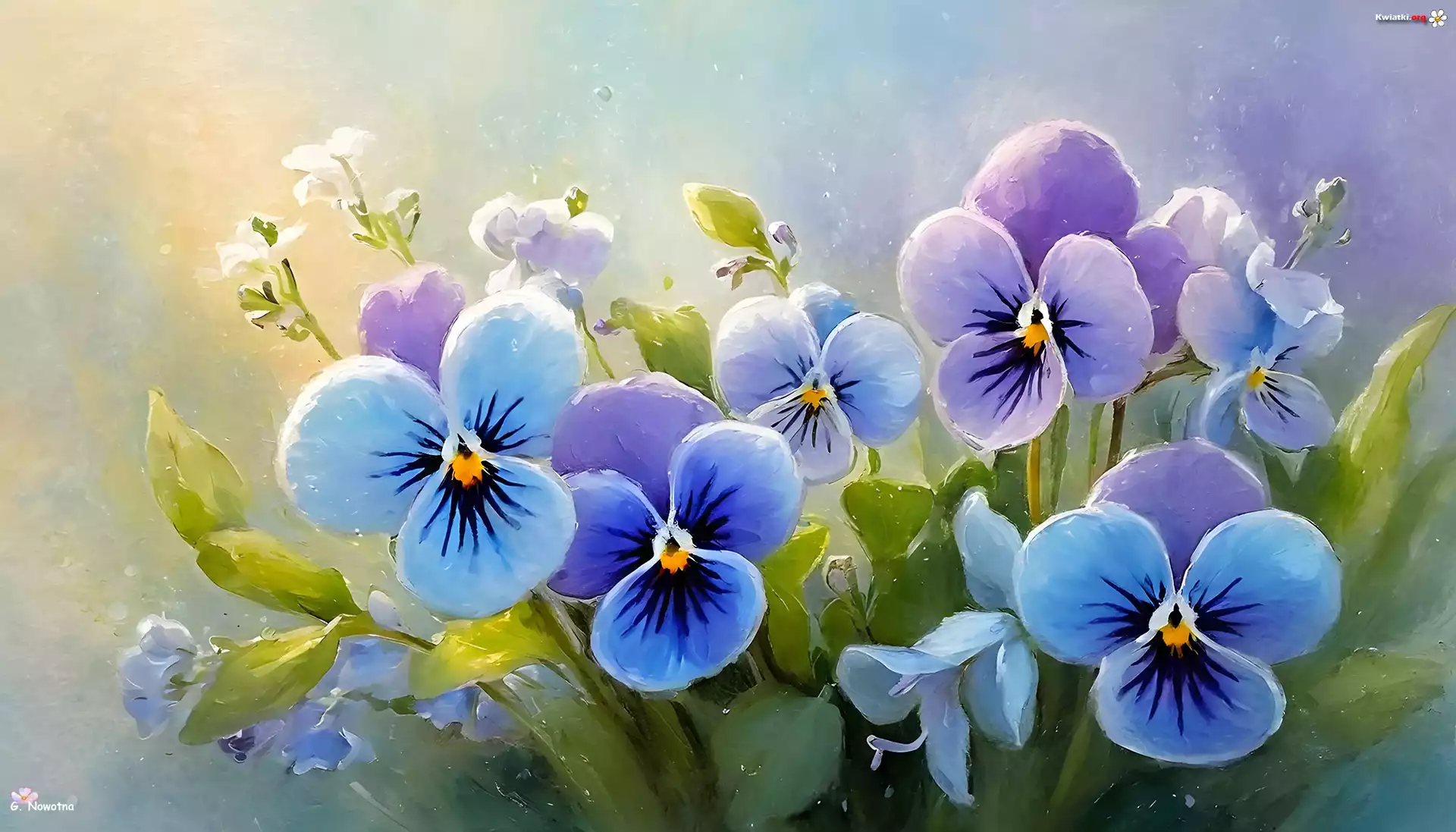 Niebieskie, Fioletowe, Bratki, Grafika AI - Zdjęcia