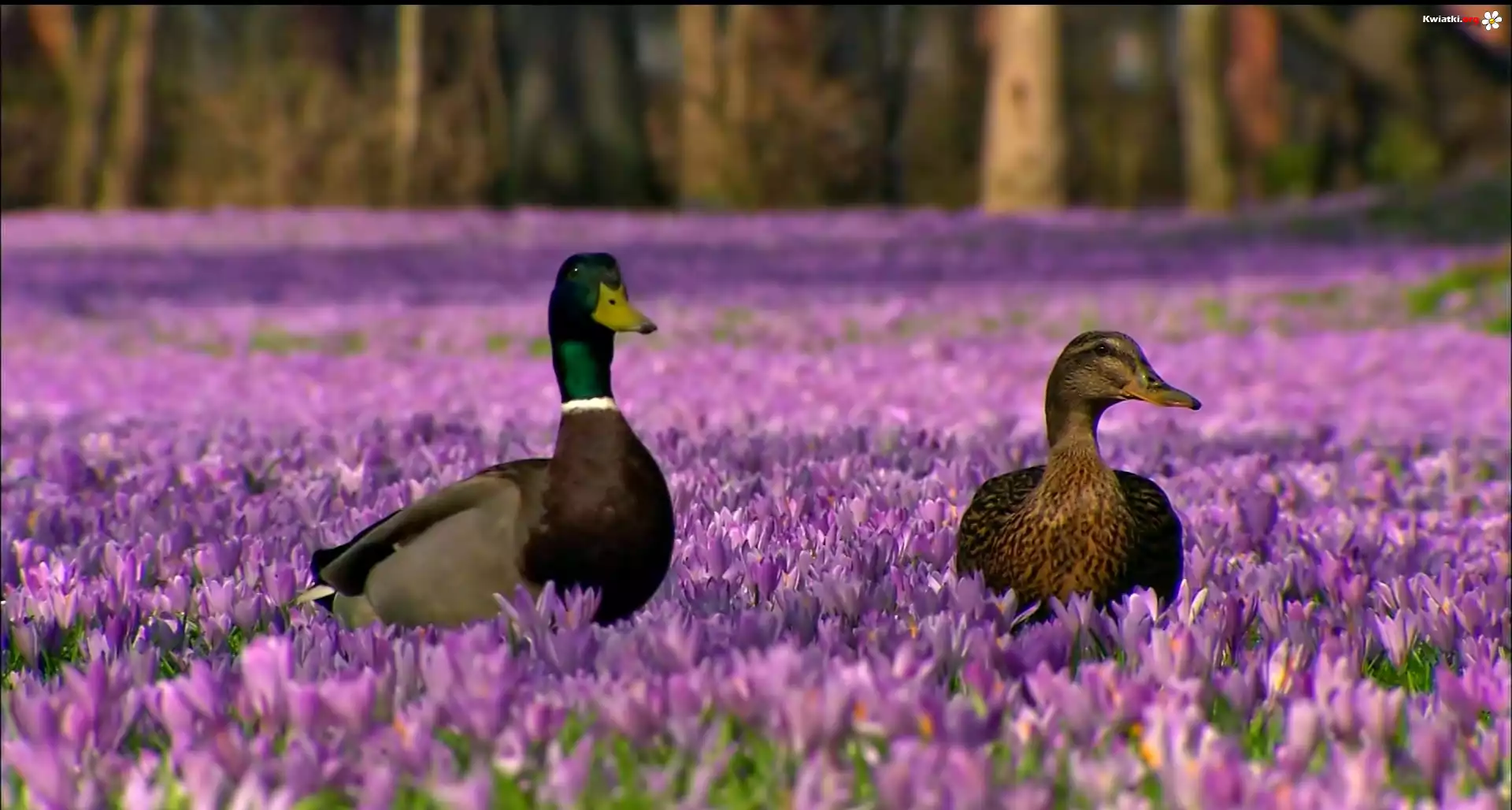 Fioletowe, Kwiaty, Krokusy, Dwie, kaczki - Zdjęcia