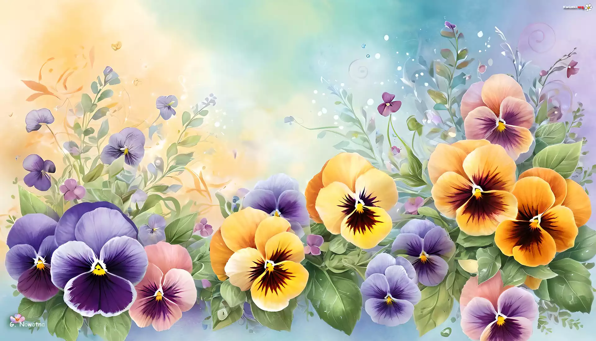 Kolorowe, Bratki, Żółte, Fioletowe, Kwiaty, Grafika - Zdjęcia