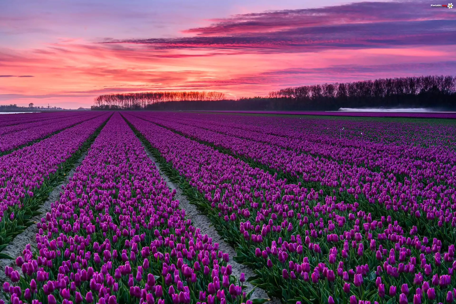 Kwiat Pole, Fioletowe, Tulipany, Plantacja, Drzewa, Zachód słońca
