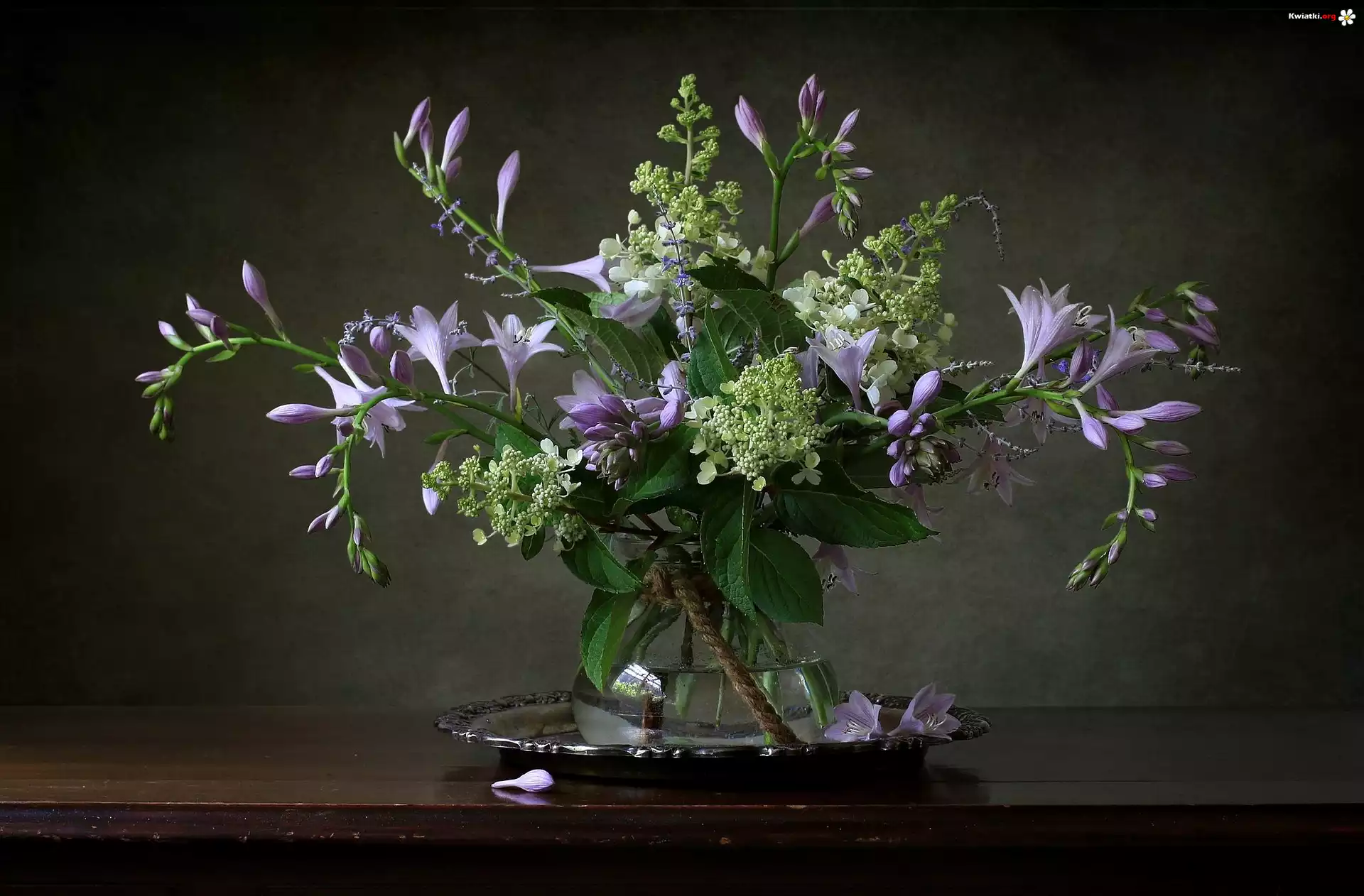 Fioletowe, Białe, Kwiaty, Wazon, Taca, Bukiet - Zdjęcia